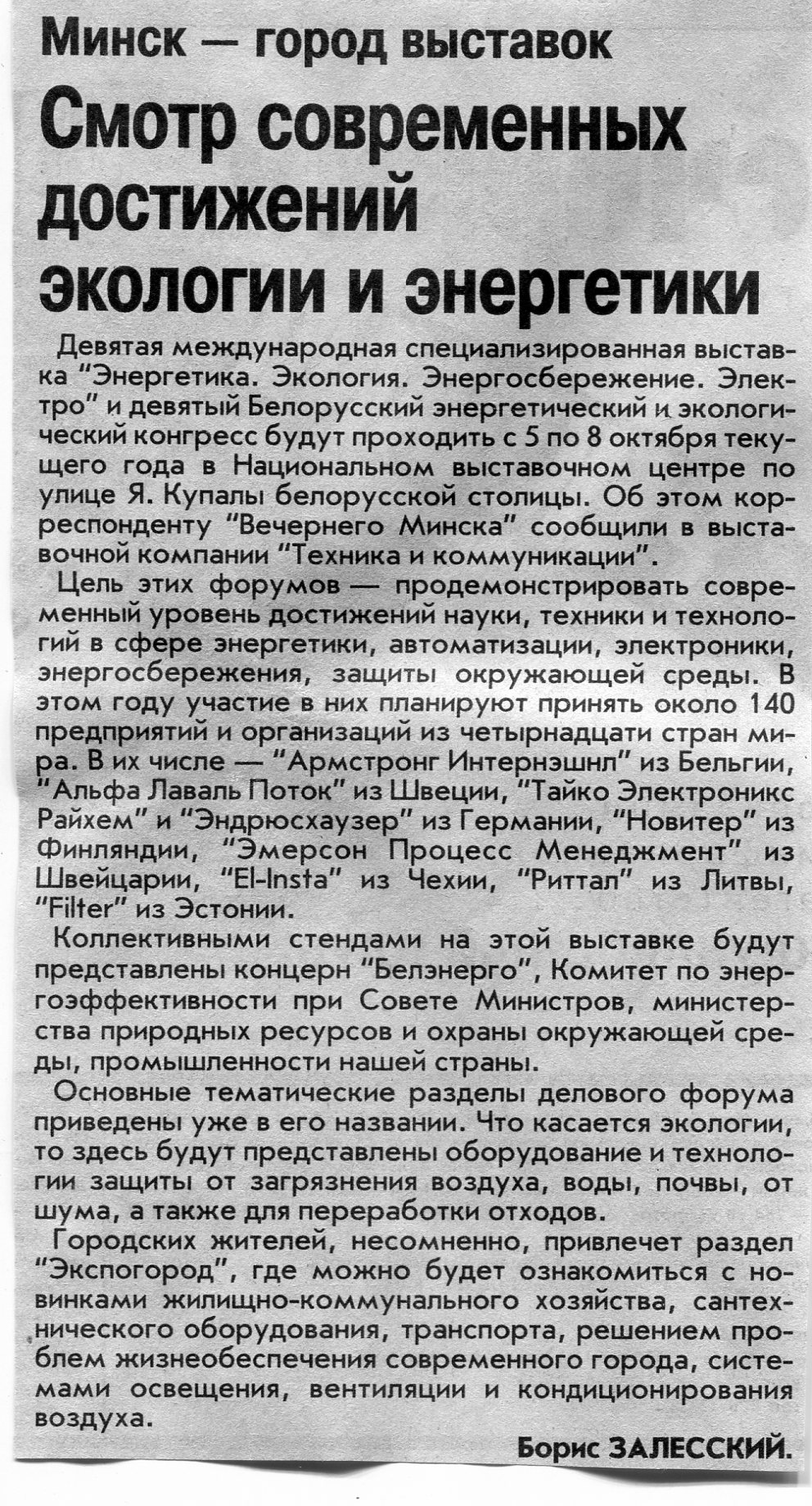Залесский, Б. Смотр современных достижений экологии и энергетики / Б. Залесский // Вечерний Минск. – 2004. - 27 июл.