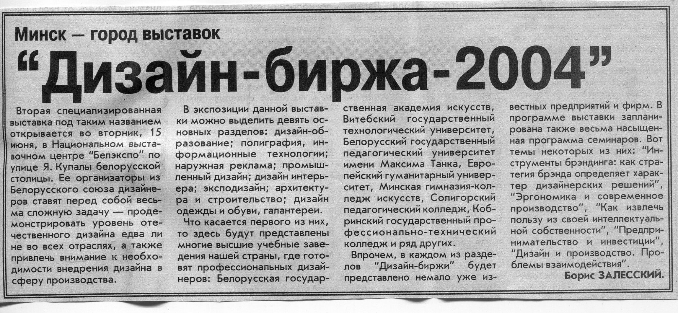 Залесский, Б. "Дизайн-биржа-2004" / Б. Залесский // Вечерний Минск. – 2004. - 11 июн.