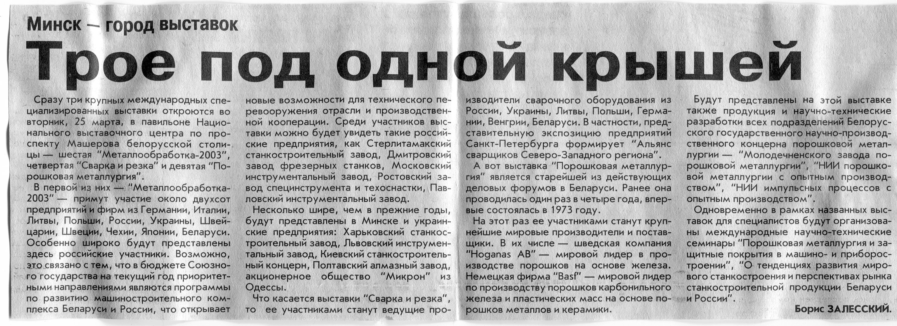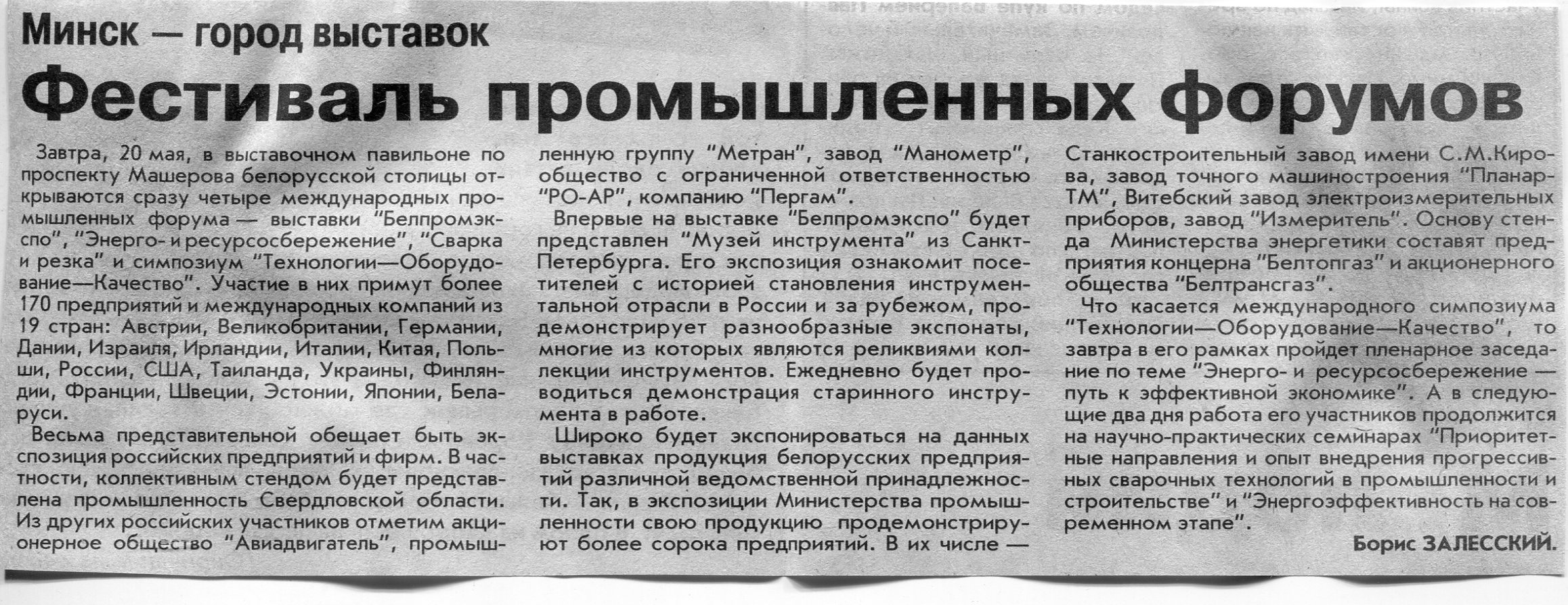 Залесский, Б. Фестиваль промышленных форумов / Б. Залесский // Вечерний Минск. – 2003. – 19 мая.