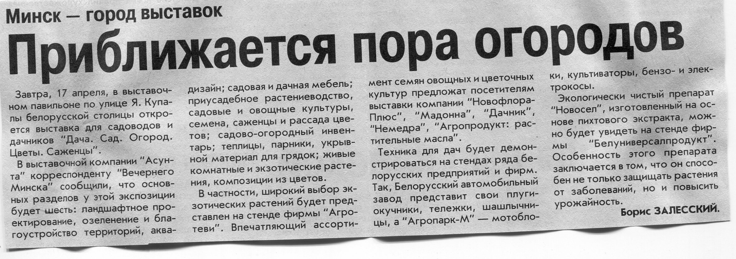Залесский, Б. Приближается пора огородов / Б. Залесский // Вечерний Минск. – 2003. – 16 апр.