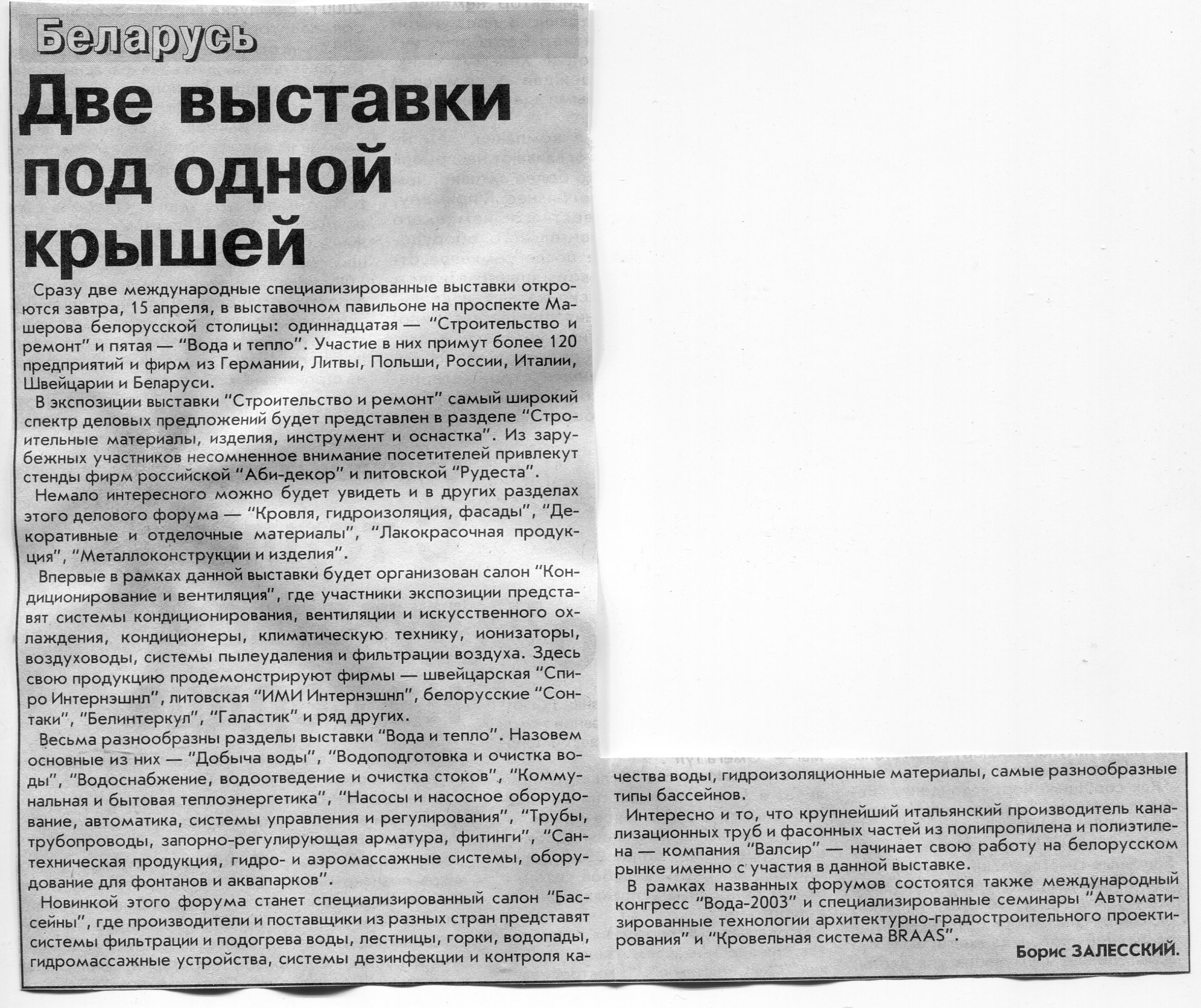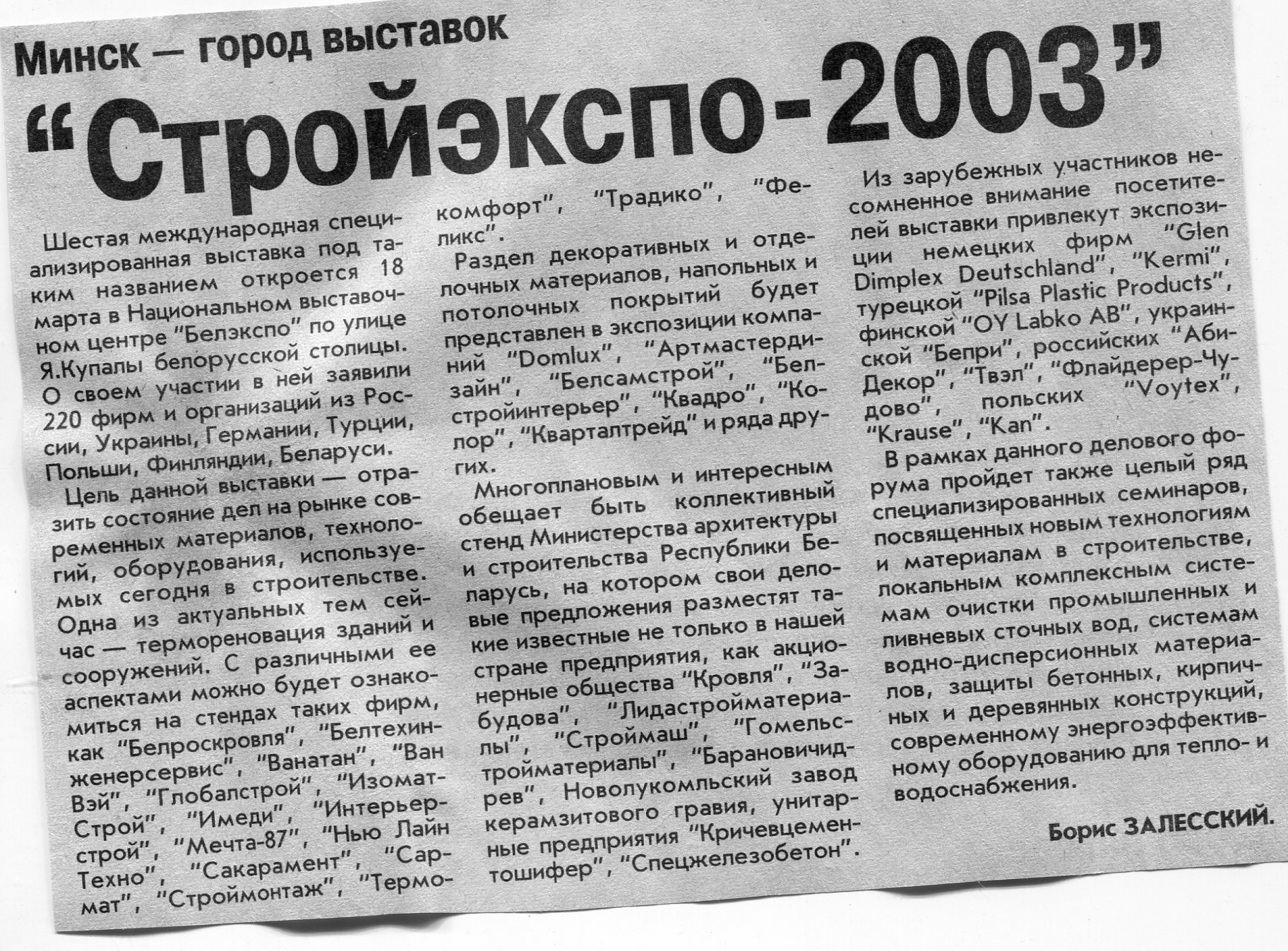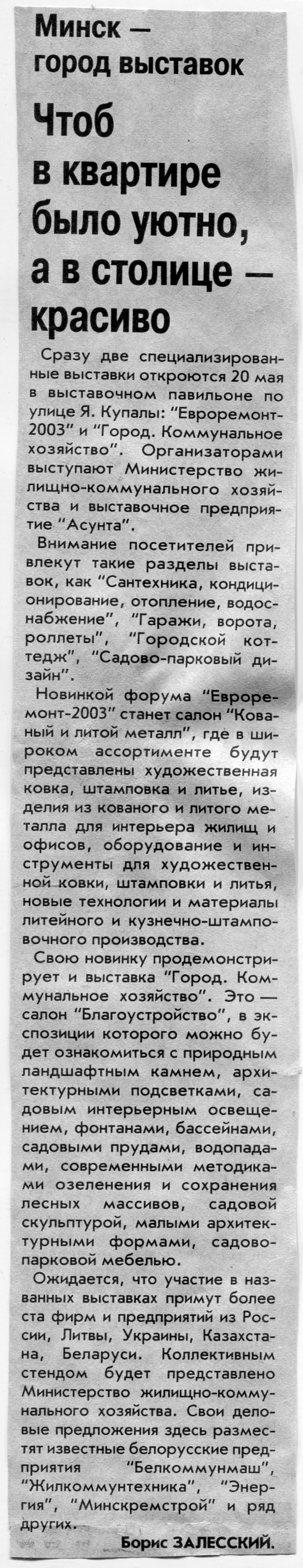 Залесский, Б. "Стройэкспо-2003" / Б. Залесский // Вечерний Минск. – 2003. – 12 мар.