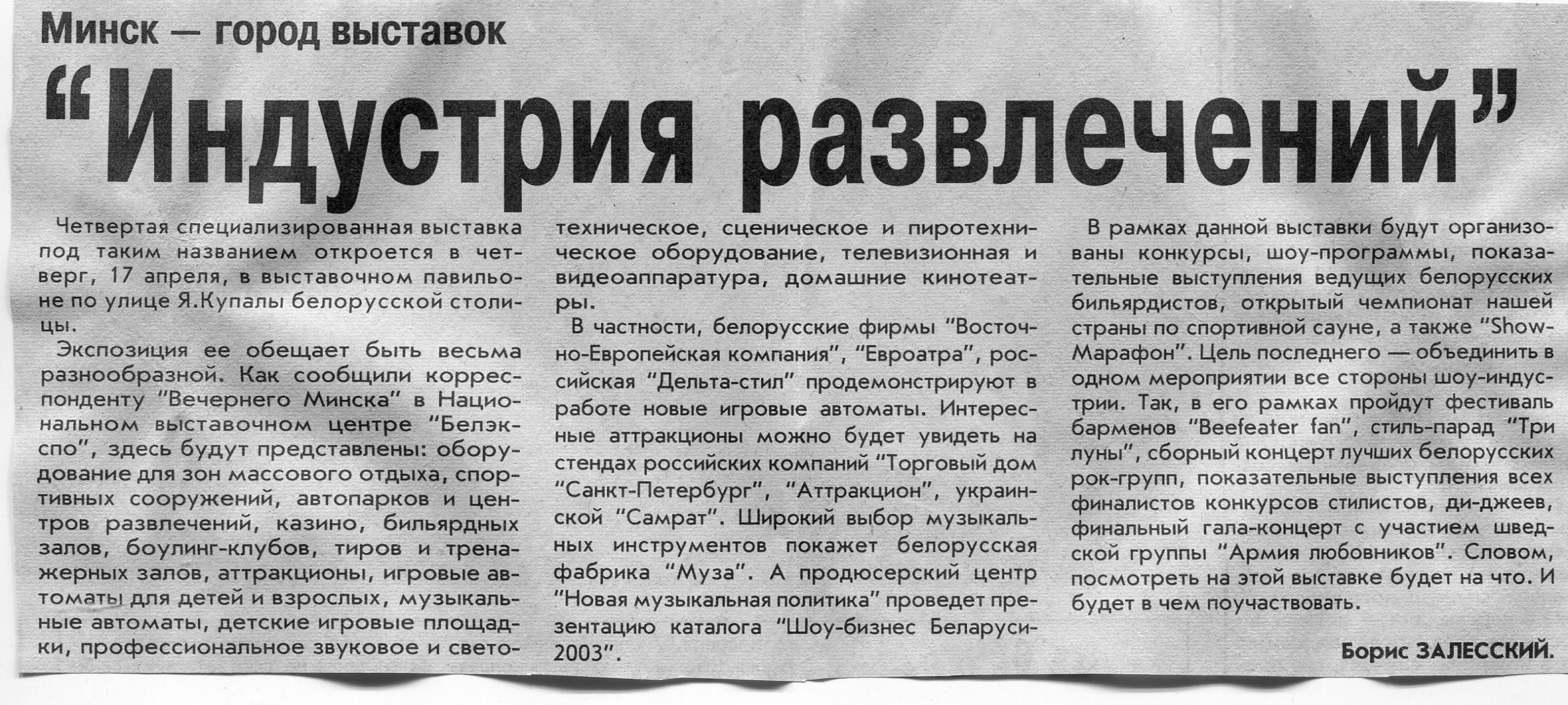 Залесский, Б. "Индустрия развлечений" / Б. Залесский // Вечерний Минск. – 2003. – 15 апр.