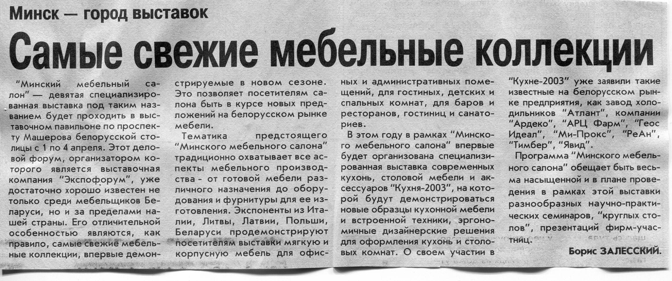 Залесский, Б. Самые свежие мебельные коллекции / Б. Залесский // Вечерний Минск. – 2003. – 13 мар.