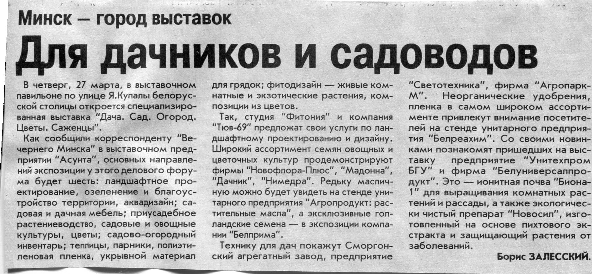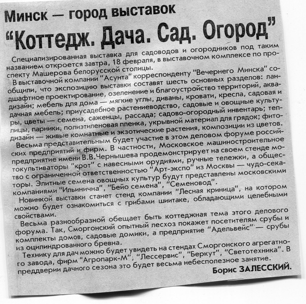 Залесский, Б. "Коттедж. Дача. Сад. Огород" / Б. Залесский // Вечерний Минск. – 2003. – 17 февр.