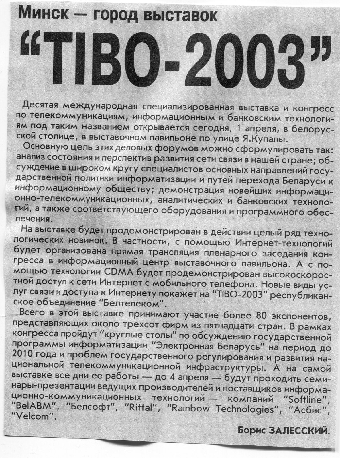 Залесский, Б. "TIBO-2003" / Б. Залесский // Вечерний Минск. – 2003. – 1 апр.