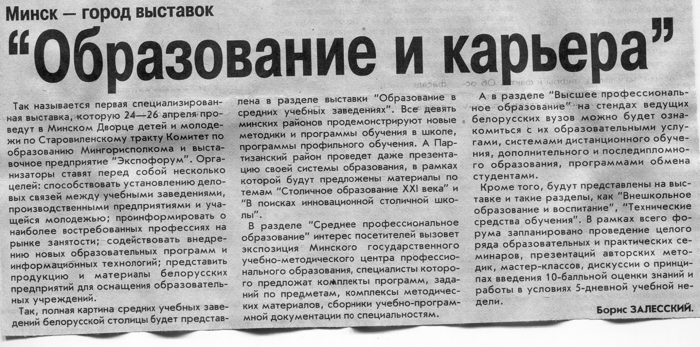 Залесский, Б. "Образование и карьера" / Б. Залесский // Вечерний Минск. – 2003. – 22 апр.