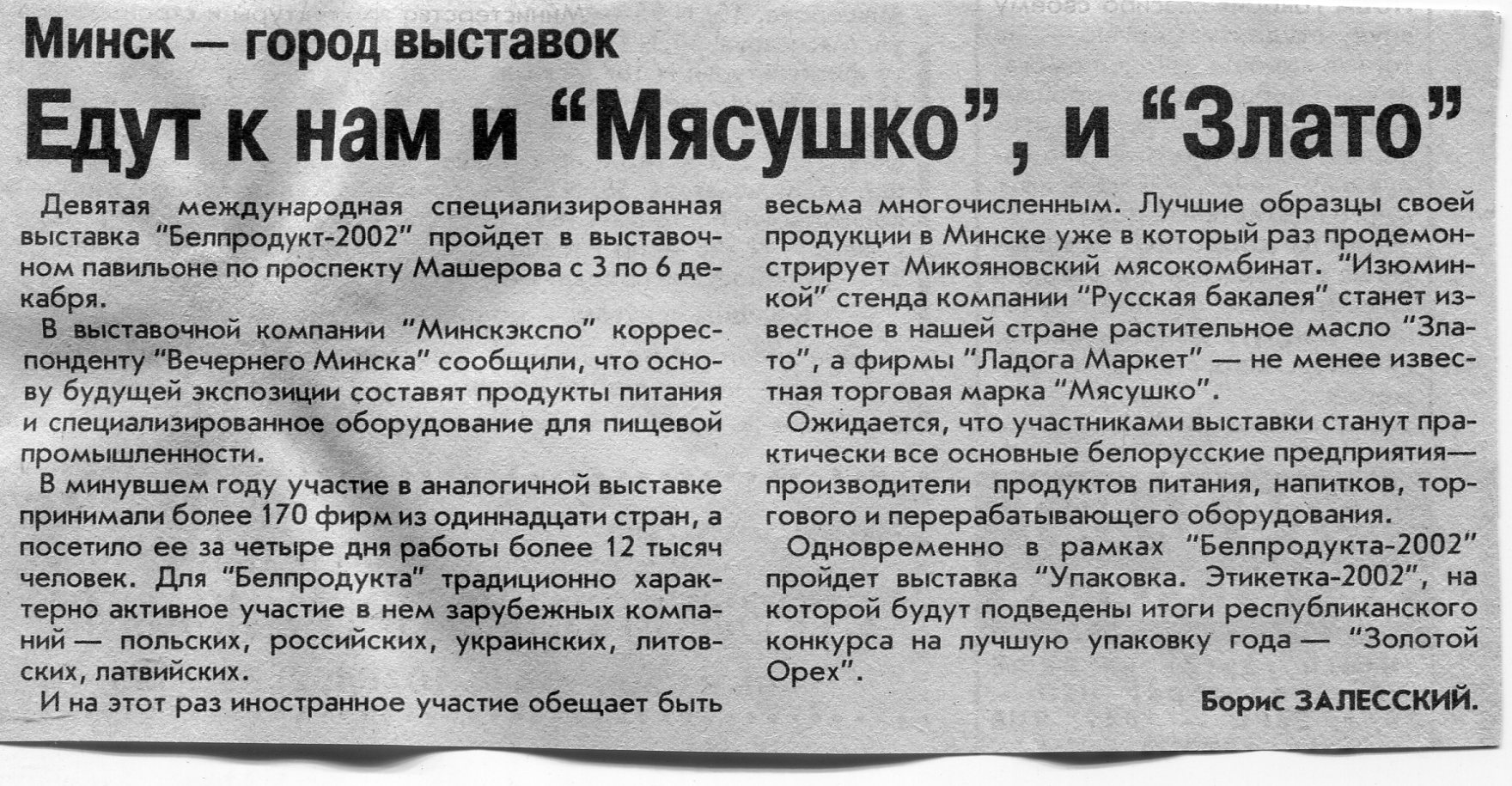 Залесский, Б. Едут к нам и "Мясушко", и "Злато" / Б. Залесский // Вечерний Минск. - 2002. - 17 окт.