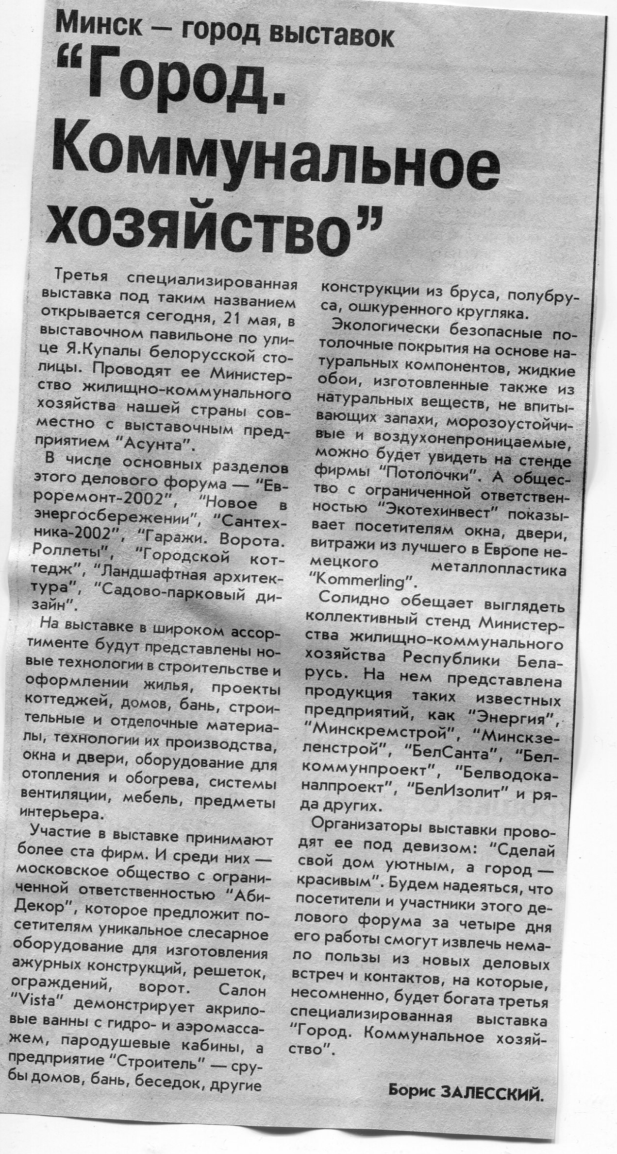 Залесский, Б. "Город. Коммунальное хозяйство" / Б. Залесский // Вечерний Минск. - 2002. - 21 мая.
