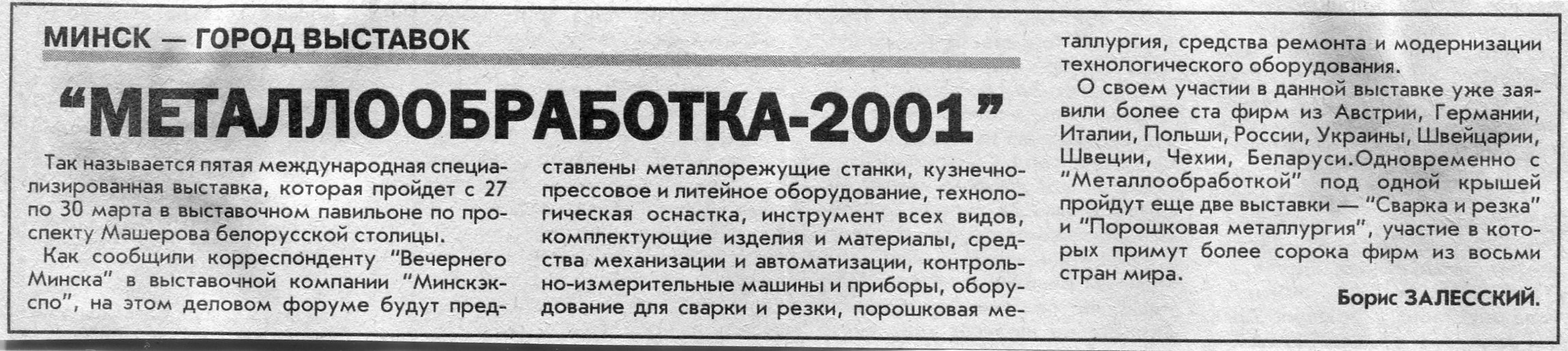 Залесский, Б. "Металлообработка-2001" / Б. Залесский // Вечерний Минск. - 2001. - 1 мар.