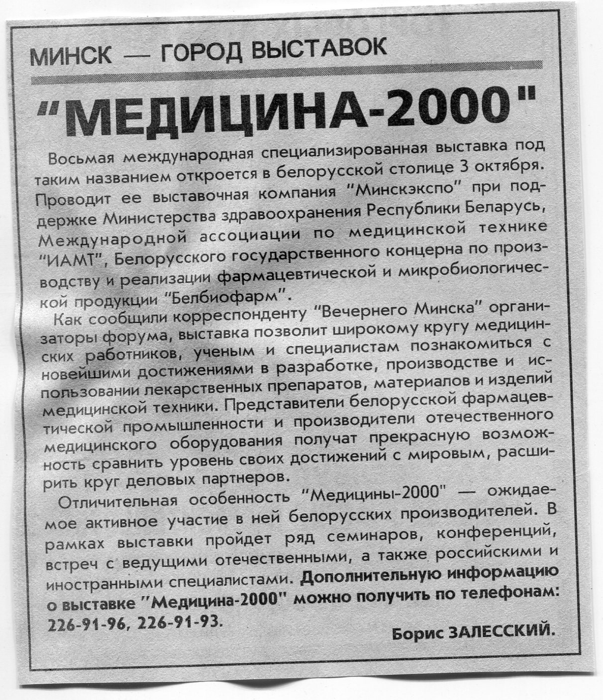 Залесский, Б. "Медицина-2000" / Б. Залесский // Вечерний Минск. - 2000. - 15 сент.
