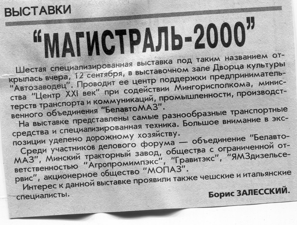 Залесский, Б. "Магистраль-2000" / Б. Залесский // Вечерний Минск. - 2000. - 13 сент.