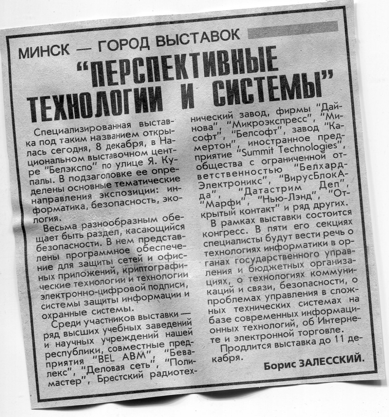 Залесский, Б. "Перспективные технологии и системы" / Б. Залесский // Вечерний Минск. - 1999. - 8 дек.