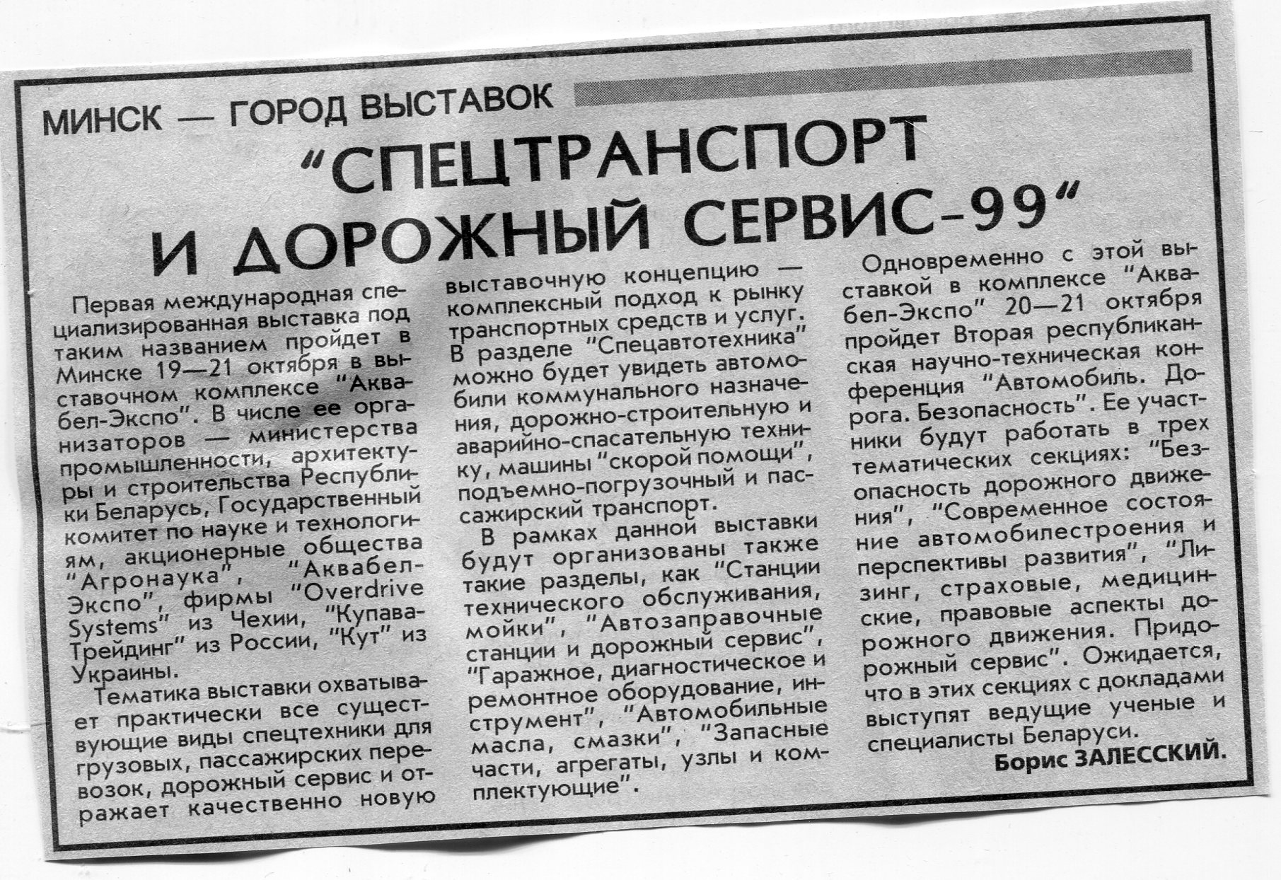 Залесский, Б. "Спецтранспорт и дорожный сервис-99" / Б. Залесский // Вечерний Минск. - 1999. - 15 окт.