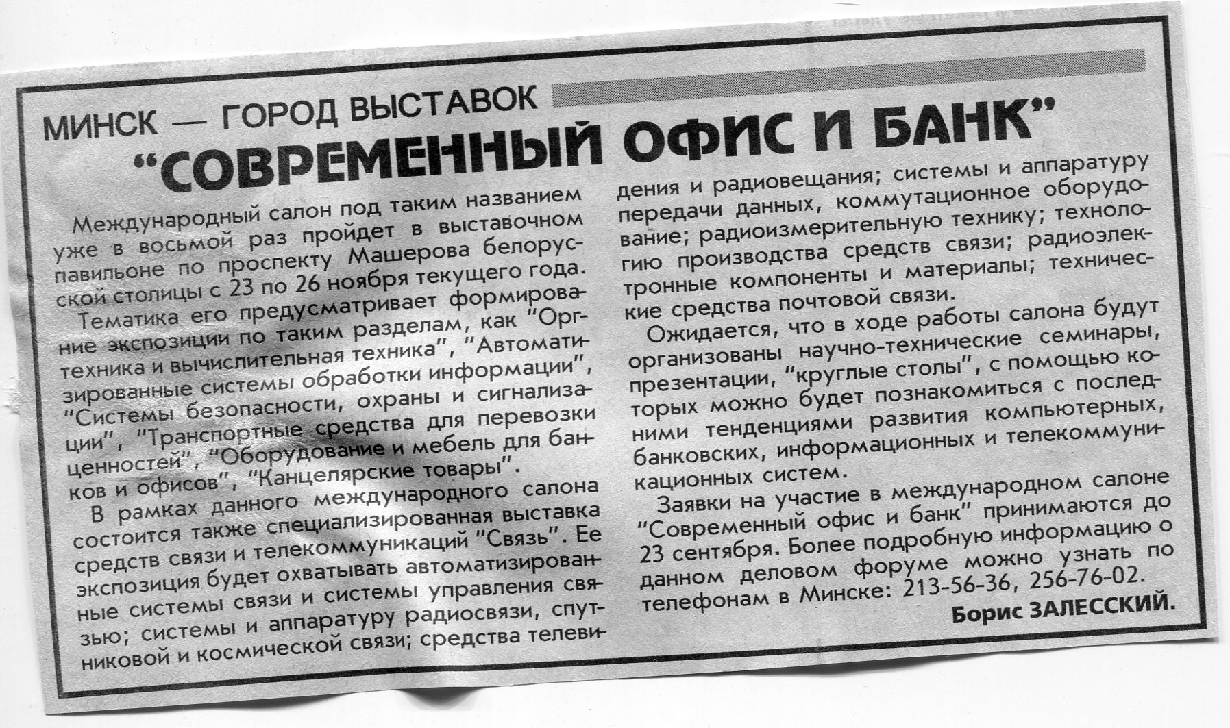 Залесский, Б. "Современный офис и банк" / Б. Залесский // Вечерний Минск. - 1999. - 10 авг.