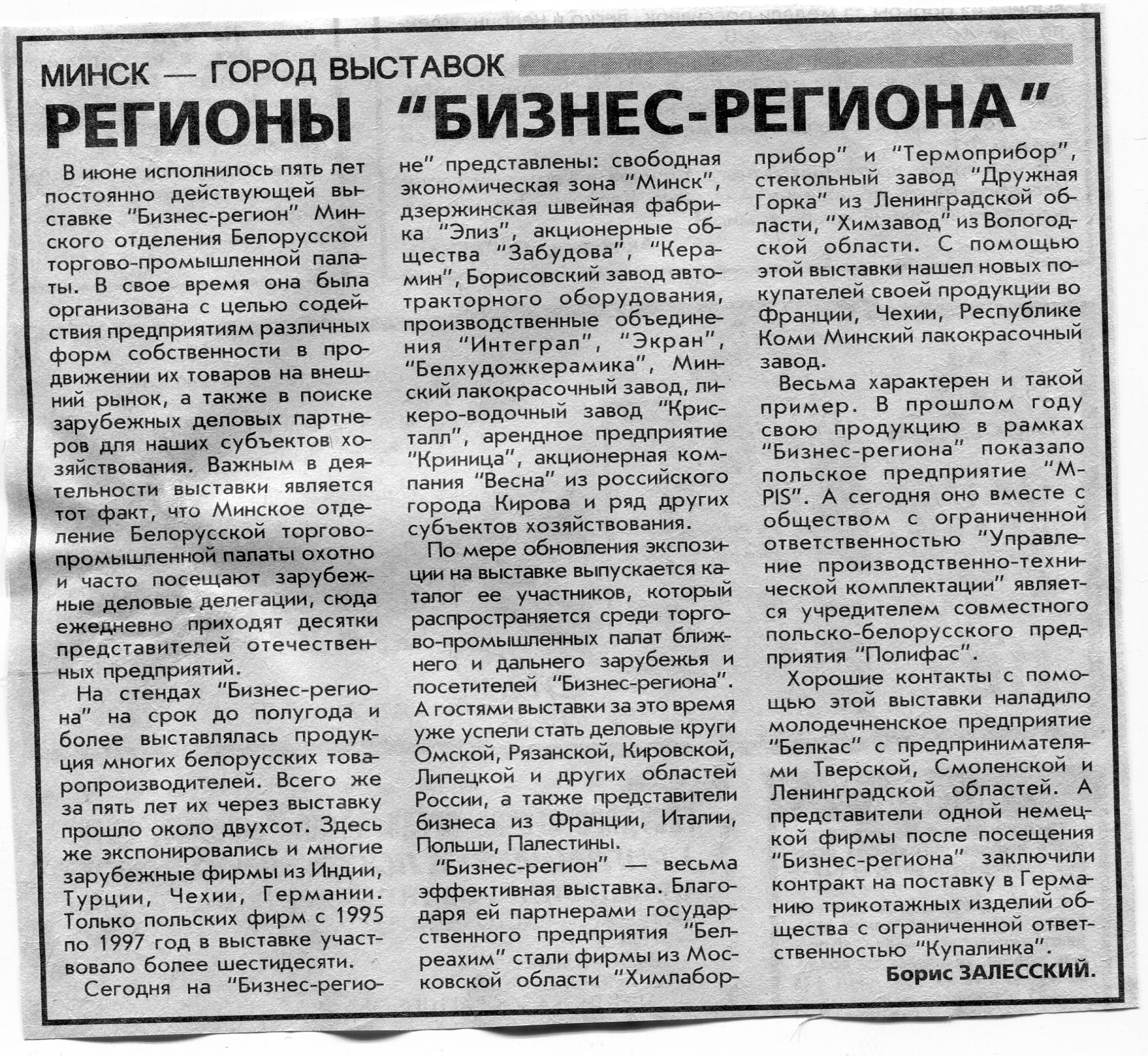 Залесский, Б. Регионы "Бизнес-региона" / Б. Залесский // Вечерний Минск. - 1999. - 7 июл.