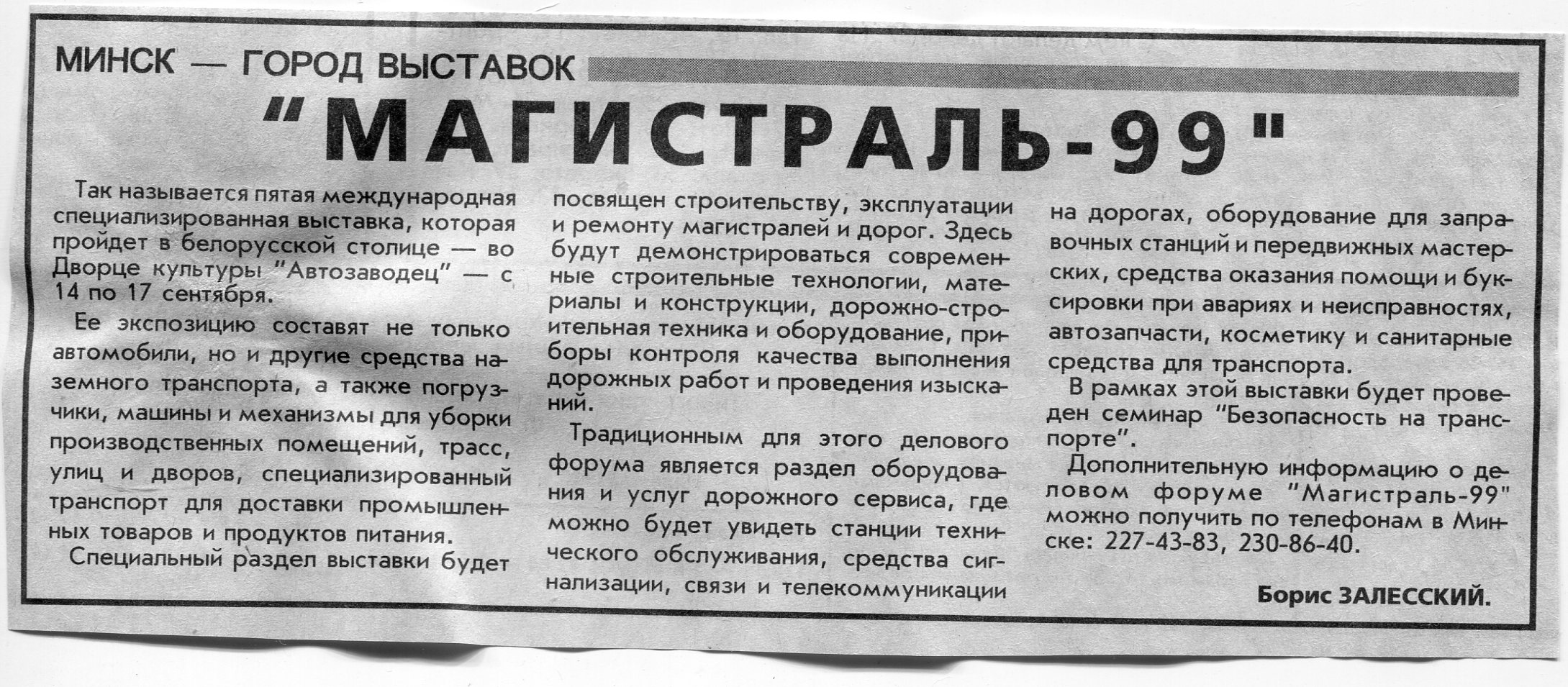 Залесский, Б. "Магистраль-99" / Б. Залесский // Вечерний Минск. - 1999. - 30 июл.