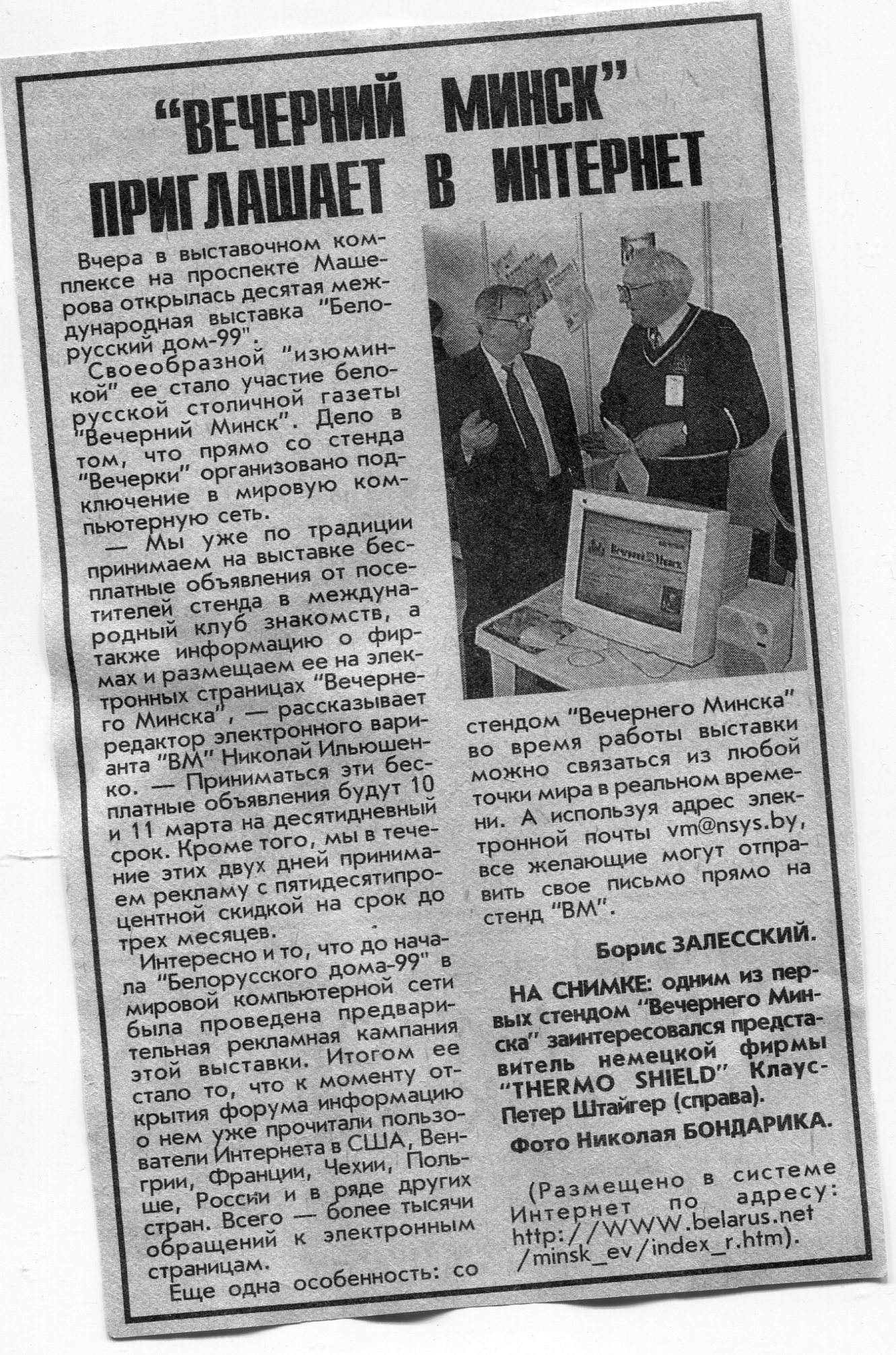 Залесский, Б. "Вечерний Минск" приглашает в интернет / Б. Залесский // Вечерний Минск. - 1999. - 10 мар.