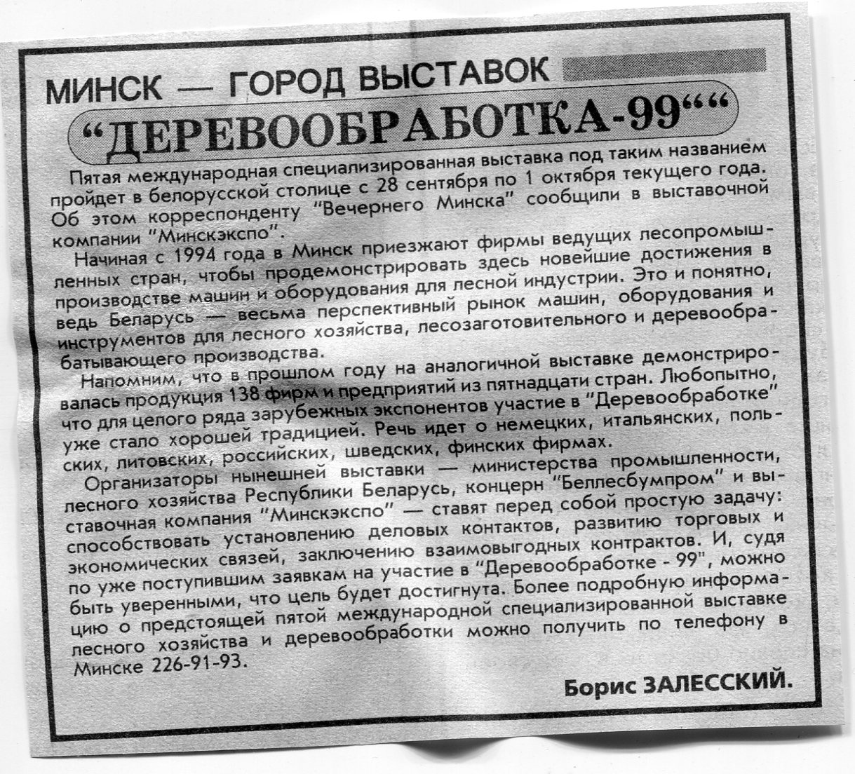 Залесский, Б. "Деревообработка-99" / Б. Залесский // Вечерний Минск. - 1999. - 4 авг.