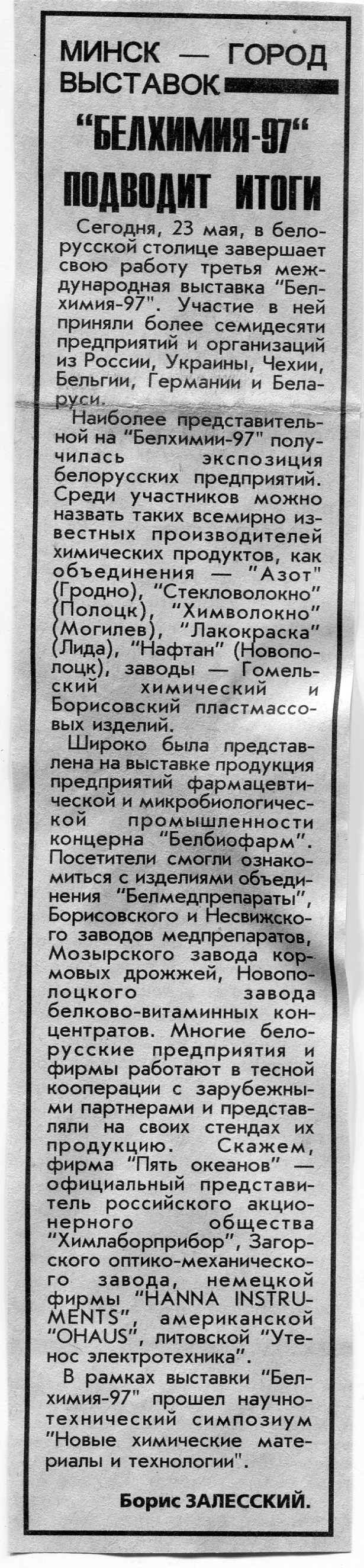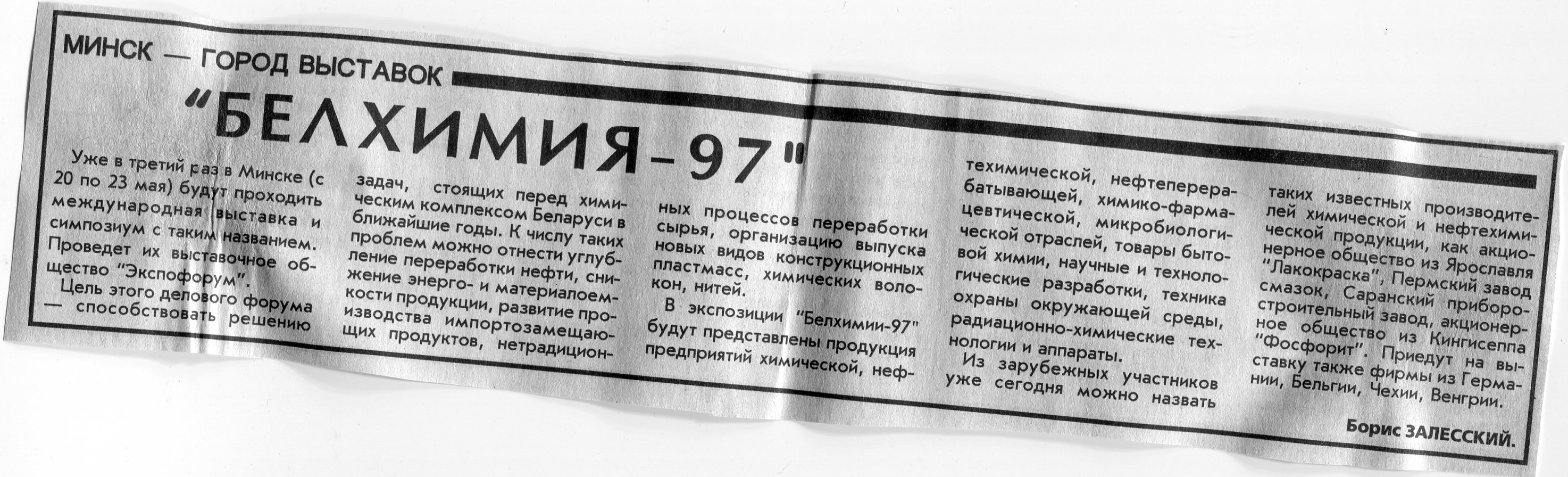 Залесский, Б. "Белхимия-97" подводит итоги / Б. Залесский // Вечерний Минск. - 1997. - 23 мая.