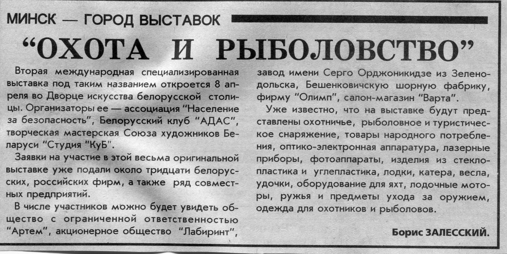 Залесский, Б. "Охота и рыболовство" / Б. Залесский // Вечерний Минск. - 1997. - 2 апр.