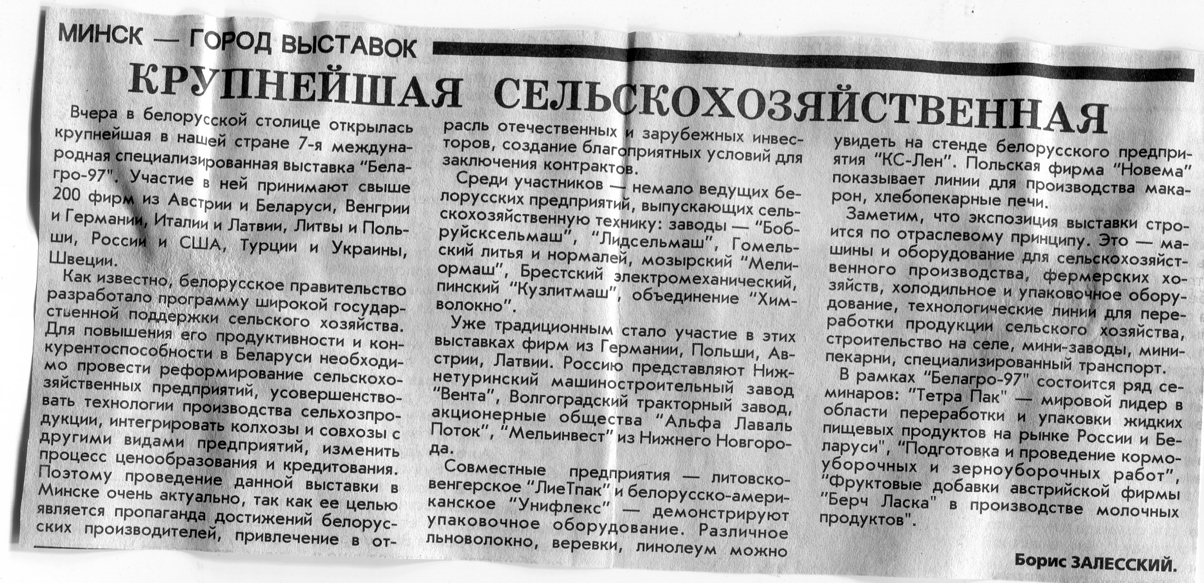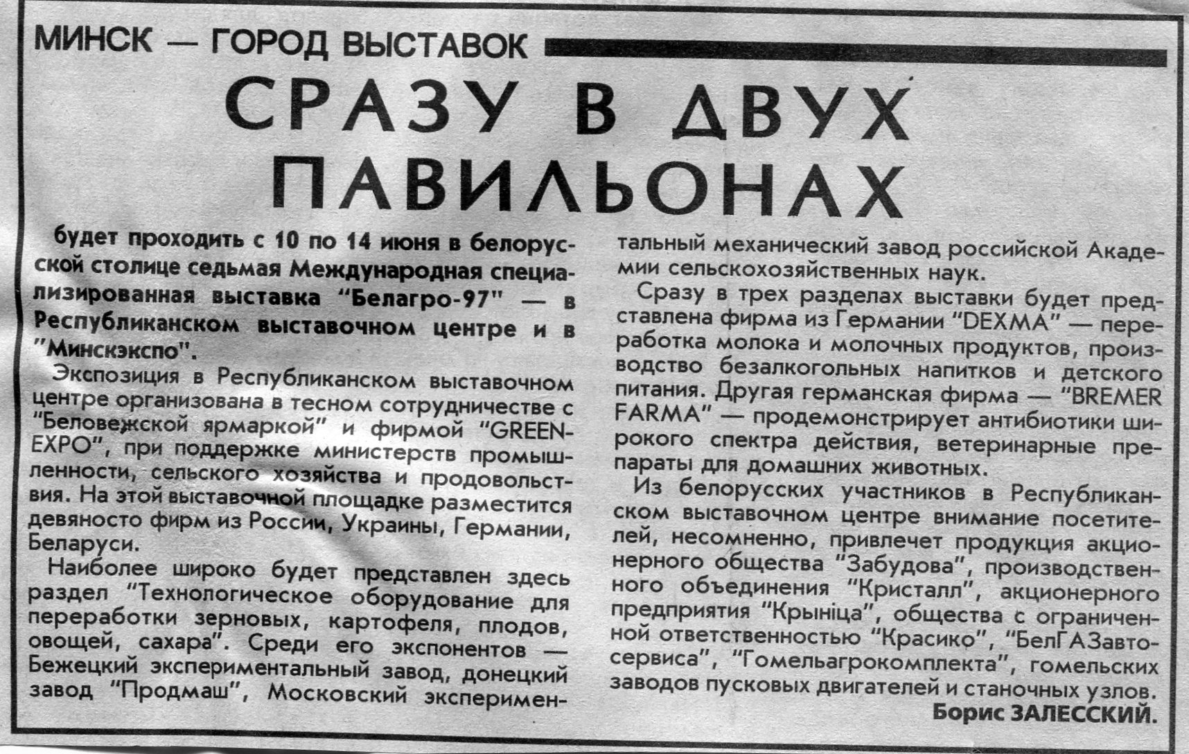 Залесский, Б. "Белагро-97" / Б. Залесский // Вечерний Минск. - 1997. - 28 мая.