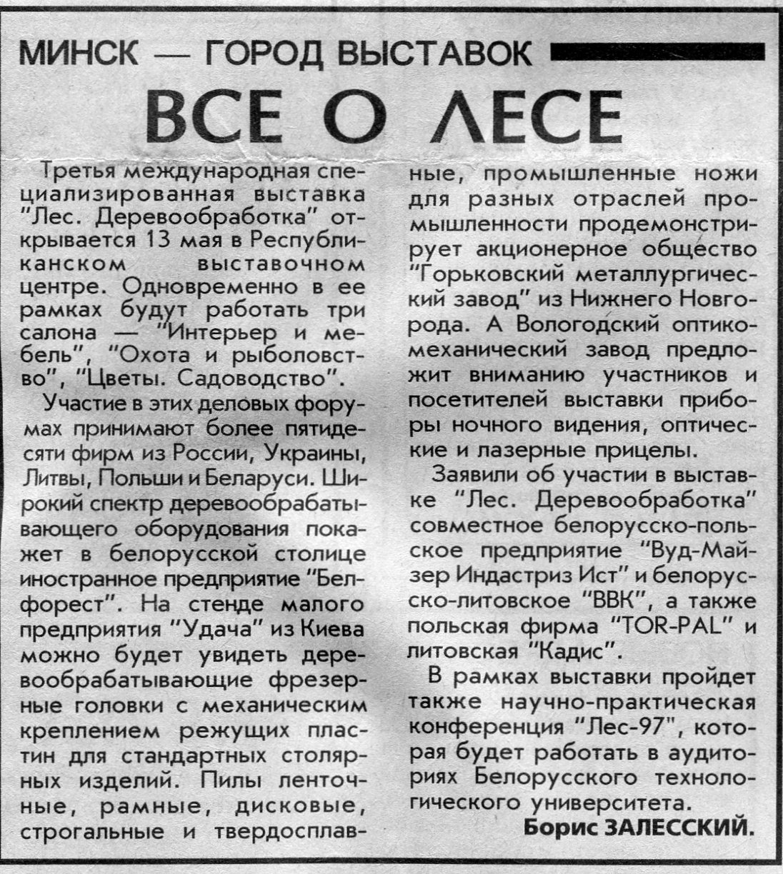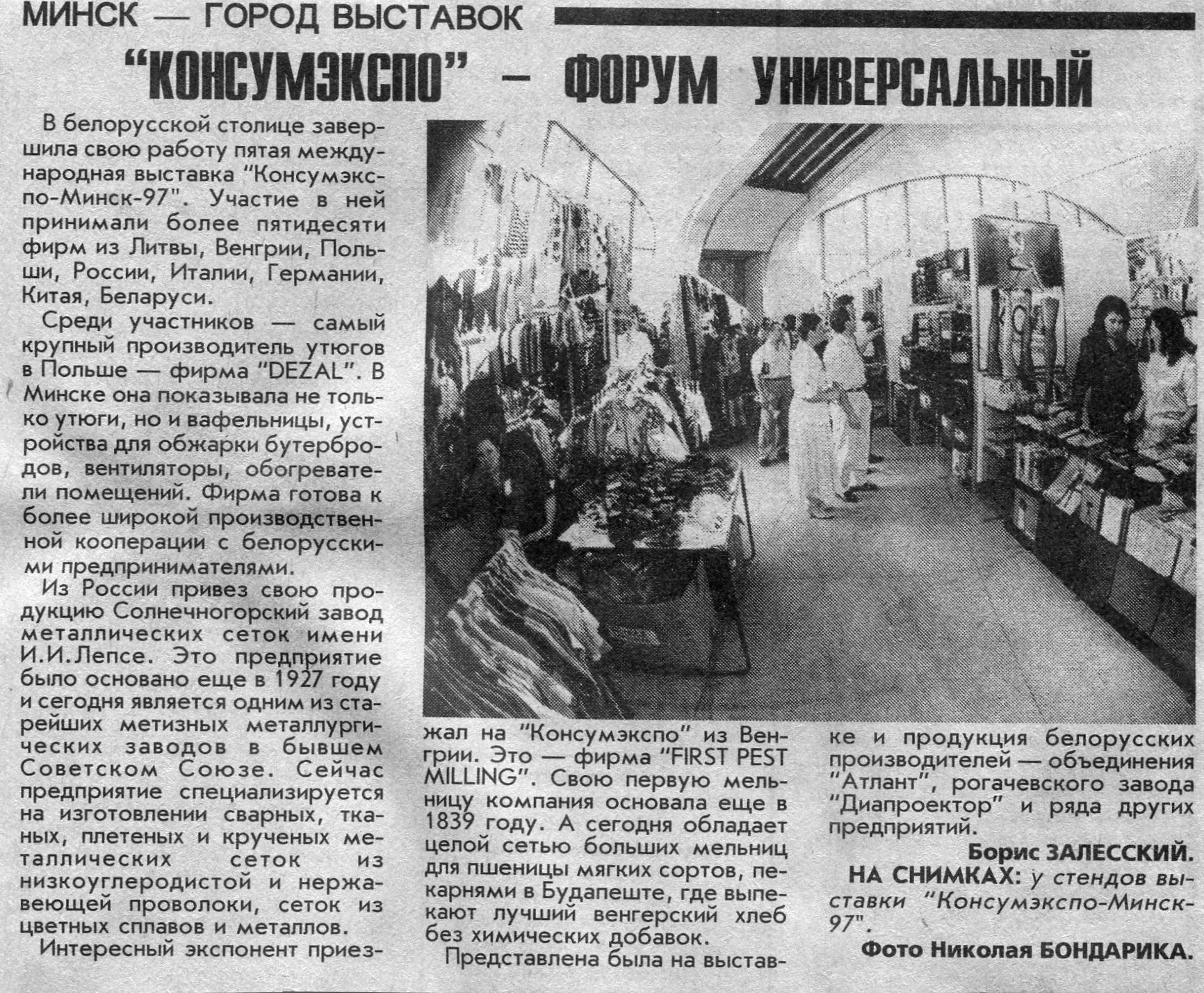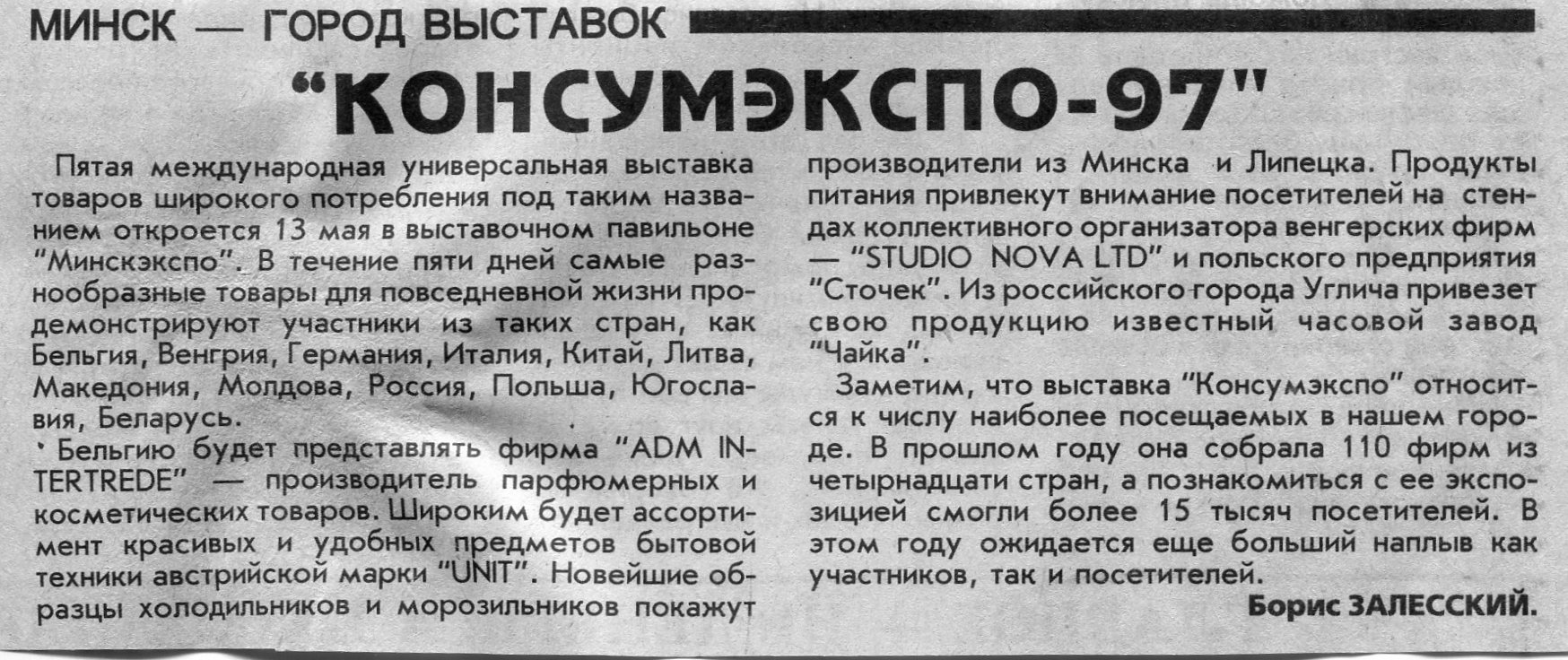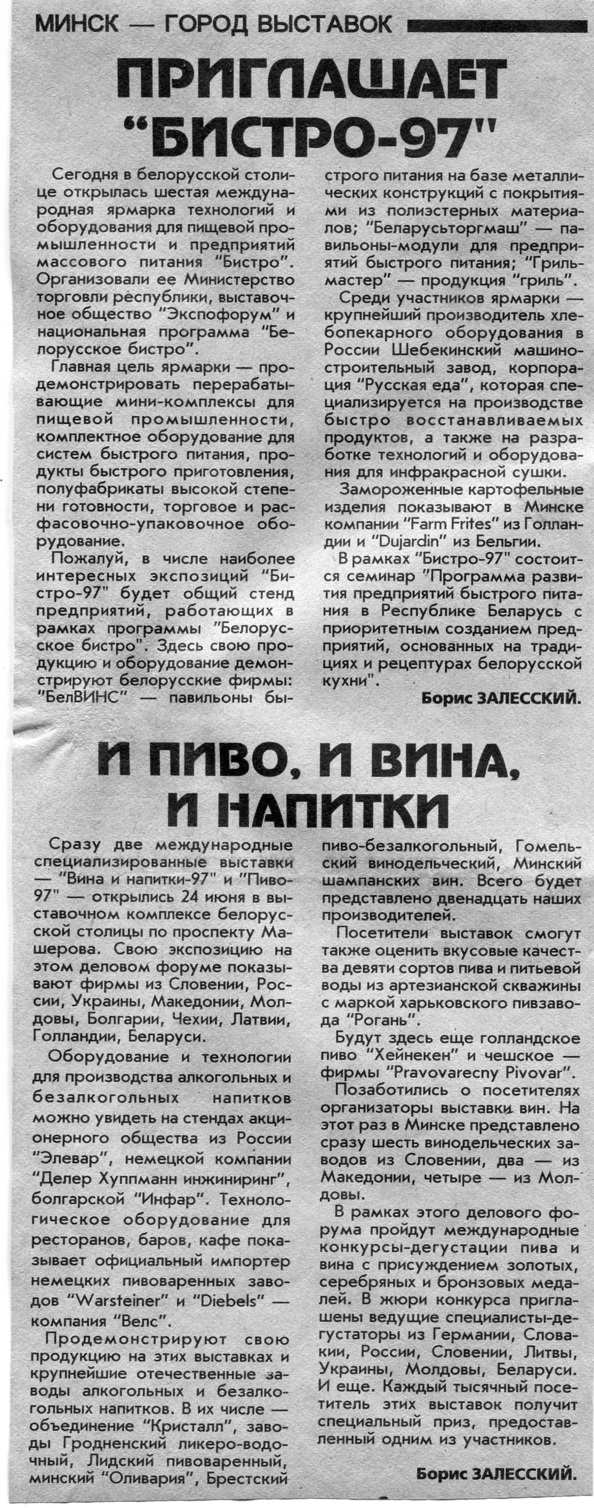 Залесский, Б. "Консумэкспо-97" / Б. Залесский // Вечерний Минск. - 1997. - 8 мая.