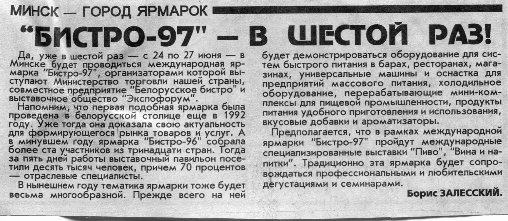 Залесский, Б. Приглашает "Бистро-97" / Б. Залесский // Вечерний Минск. - 1997. - 24 июн.