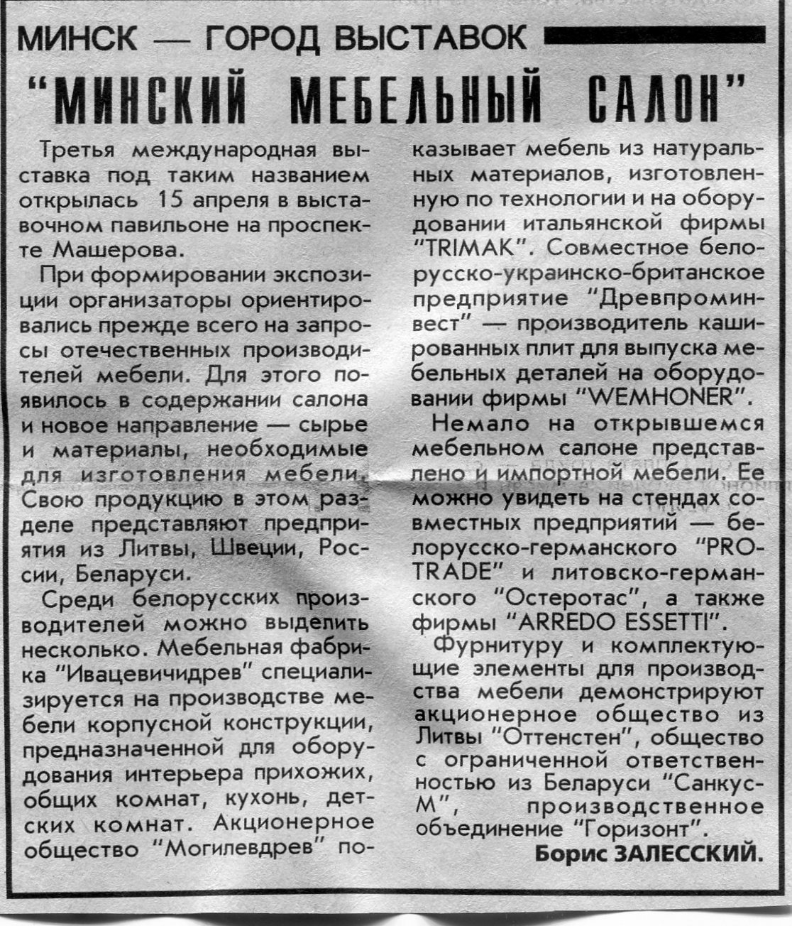 Залесский, Б. "Минский мебельный салон" / Б. Залесский // Вечерний Минск. - 1997. - 15 апр.