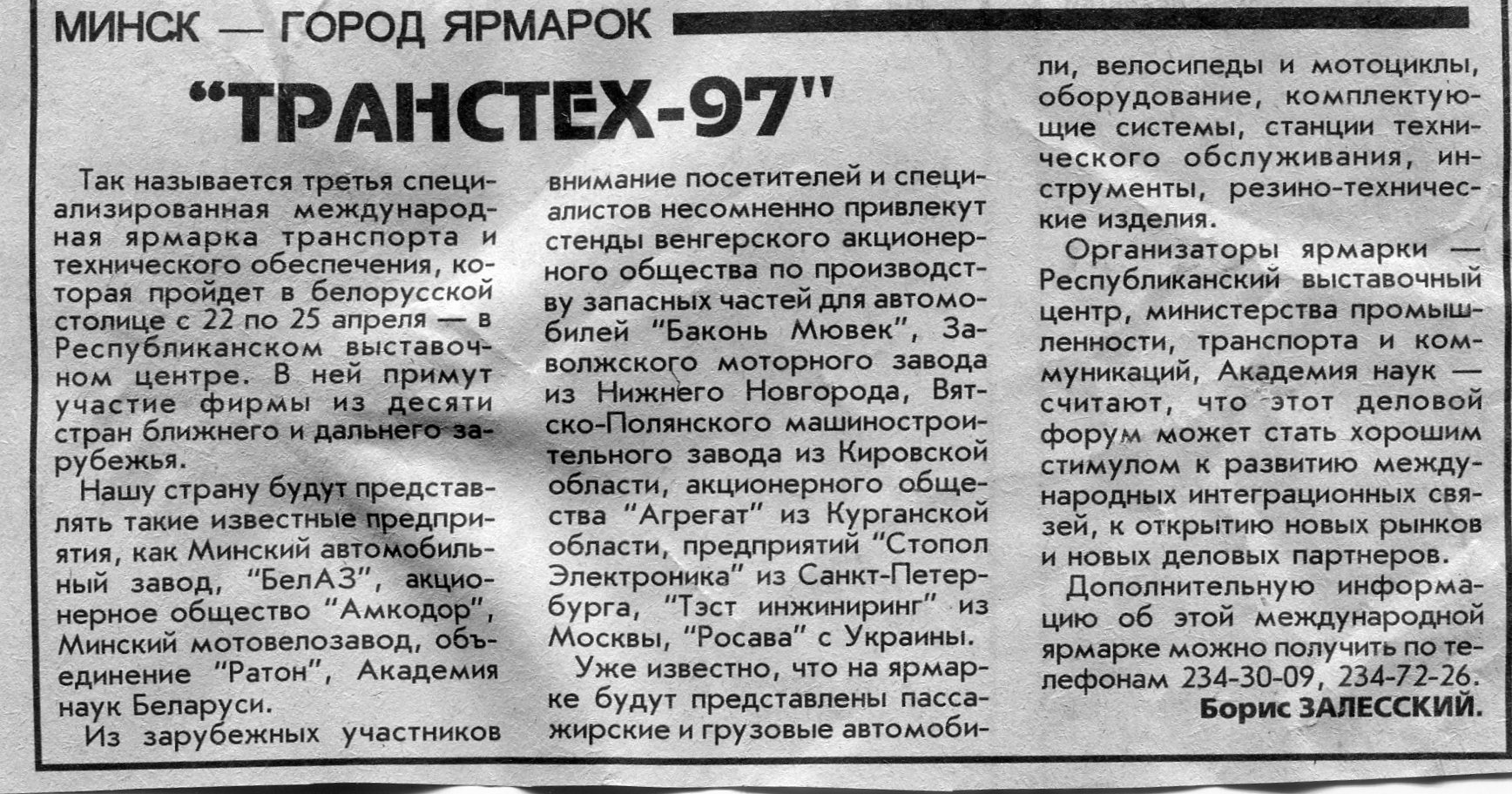 Залесский, Б. "Транстех-97" / Б. Залесский // Вечерний Минск. - 1997. - 16 апр.
