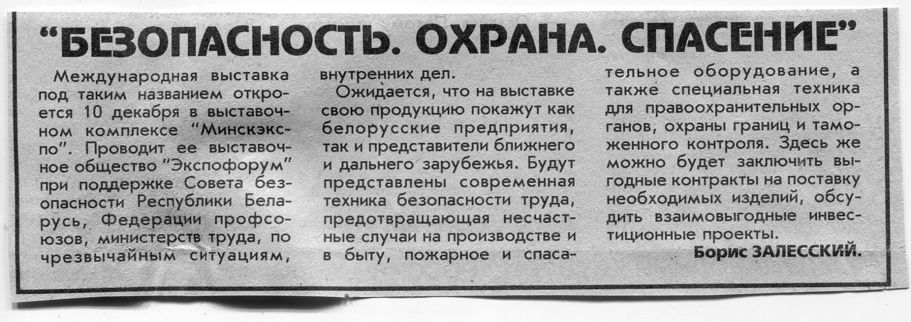 Залесский, Б. "Безопасность. Охрана. Спасение" / Б. Залесский // Вечерний Минск. - 1996. - 4 дек.