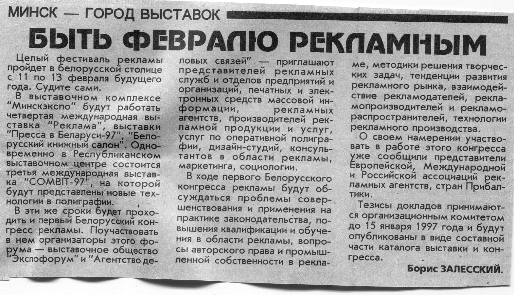 Залесский, Б. Быть февралю рекламным / Б. Залесский // Вечерний Минск. - 1996. - 27 нояб.