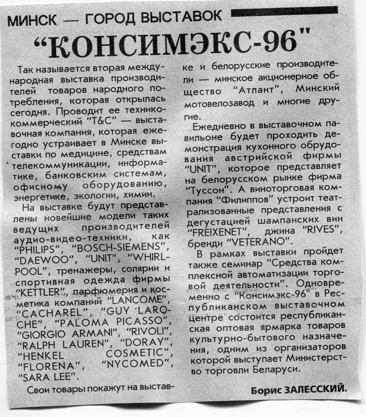 Залесский, Б. "Консимэкс-96" / Б. Залесский // Вечерний Минск. - 1996. - 19 нояб.