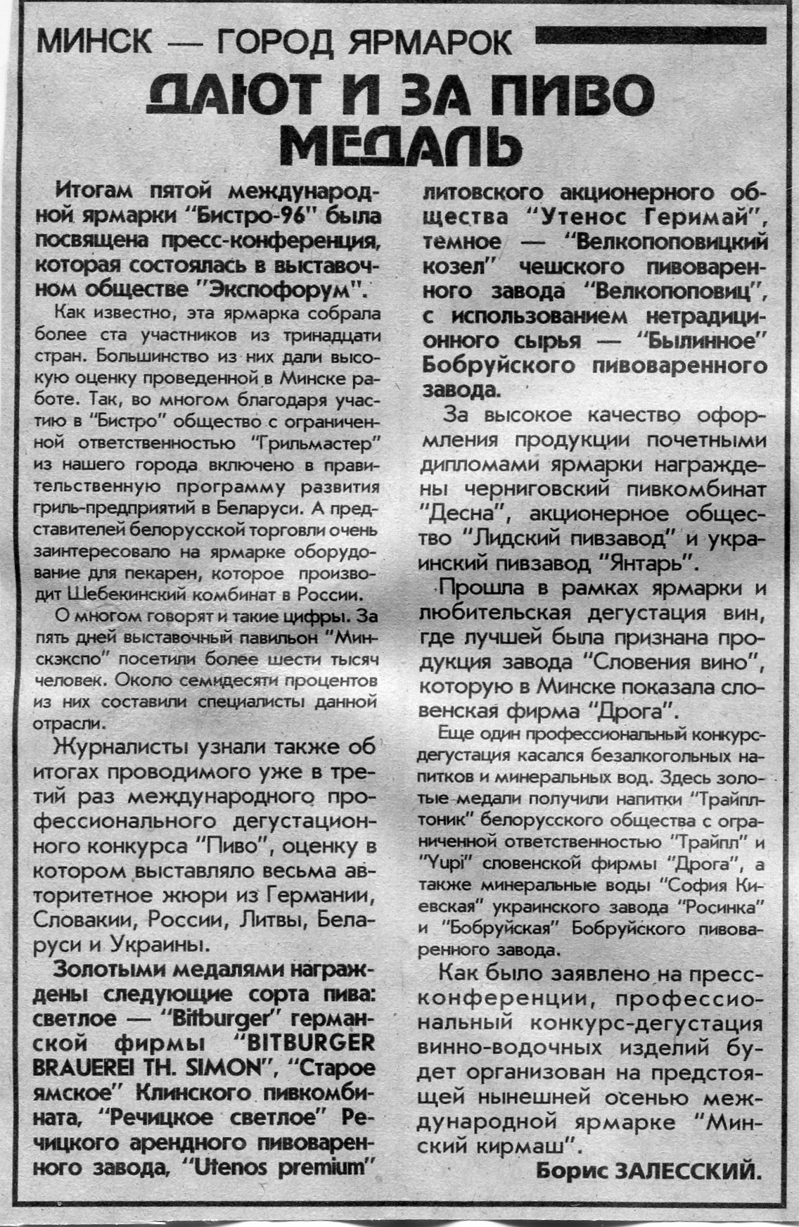 Залесский, Б. Дают и за пиво медаль / Б. Залесский // Вечерний Минск. - 1996. - 9 июл.