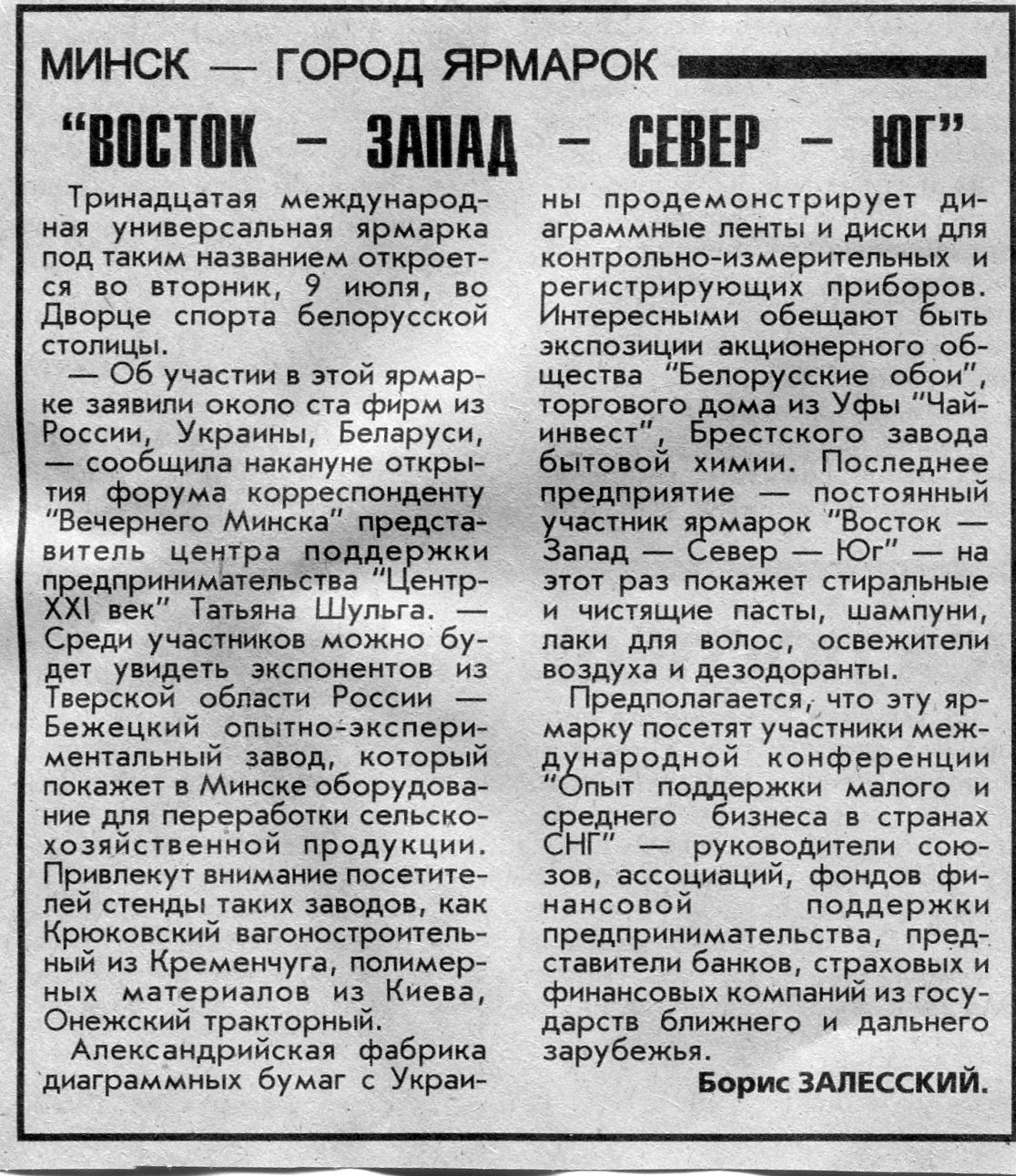 Залесский, Б. "Восток - Запад - Север -Юг" / Б. Залесский // Вечерний Минск. - 1996. - 4 июл.