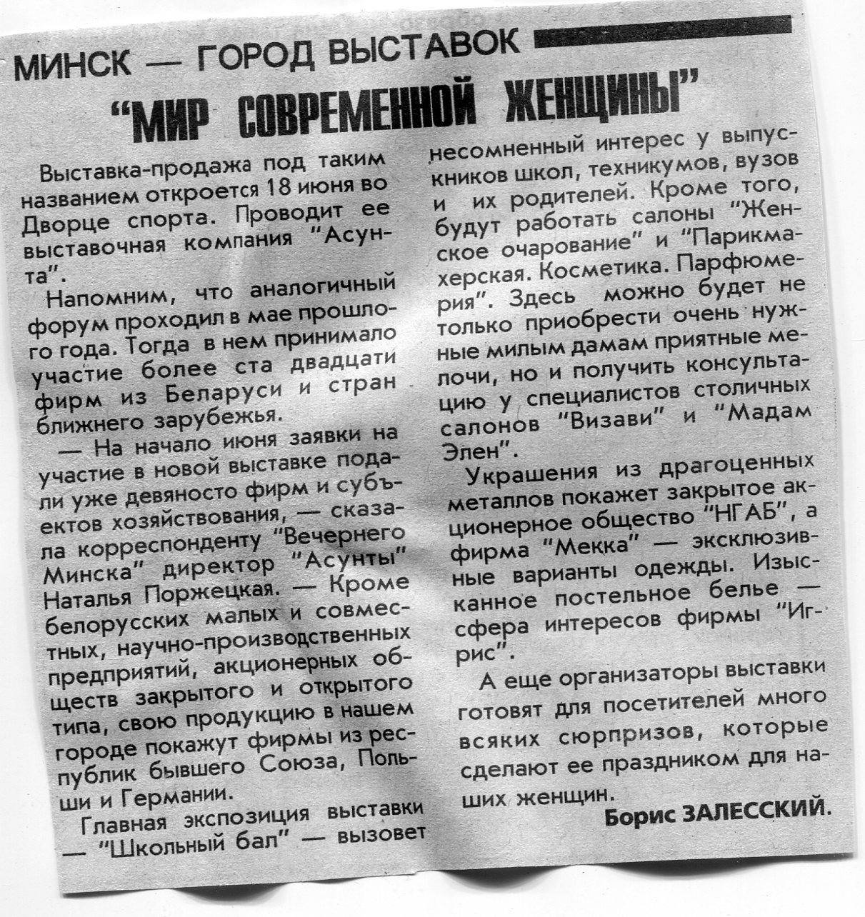 Залесский, Б. "Мир современной женщины" / Б. Залесский // Вечерний Минск. - 1996. - 7 июн.
