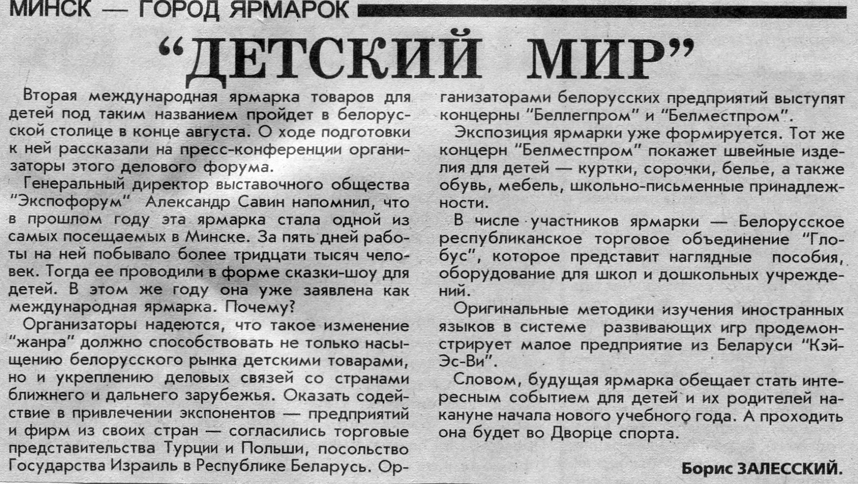 Залесский, Б. "Детский мир" / Б. Залесский // Вечерний Минск. - 1996. - 19 июн.