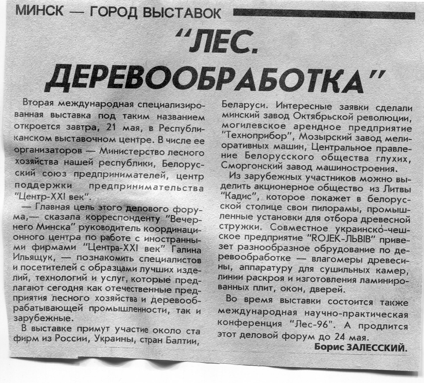 Залесский, Б. "Лес. Деревообработка" / Б. Залесский // Вечерний Минск. - 1996. - 20 мая.