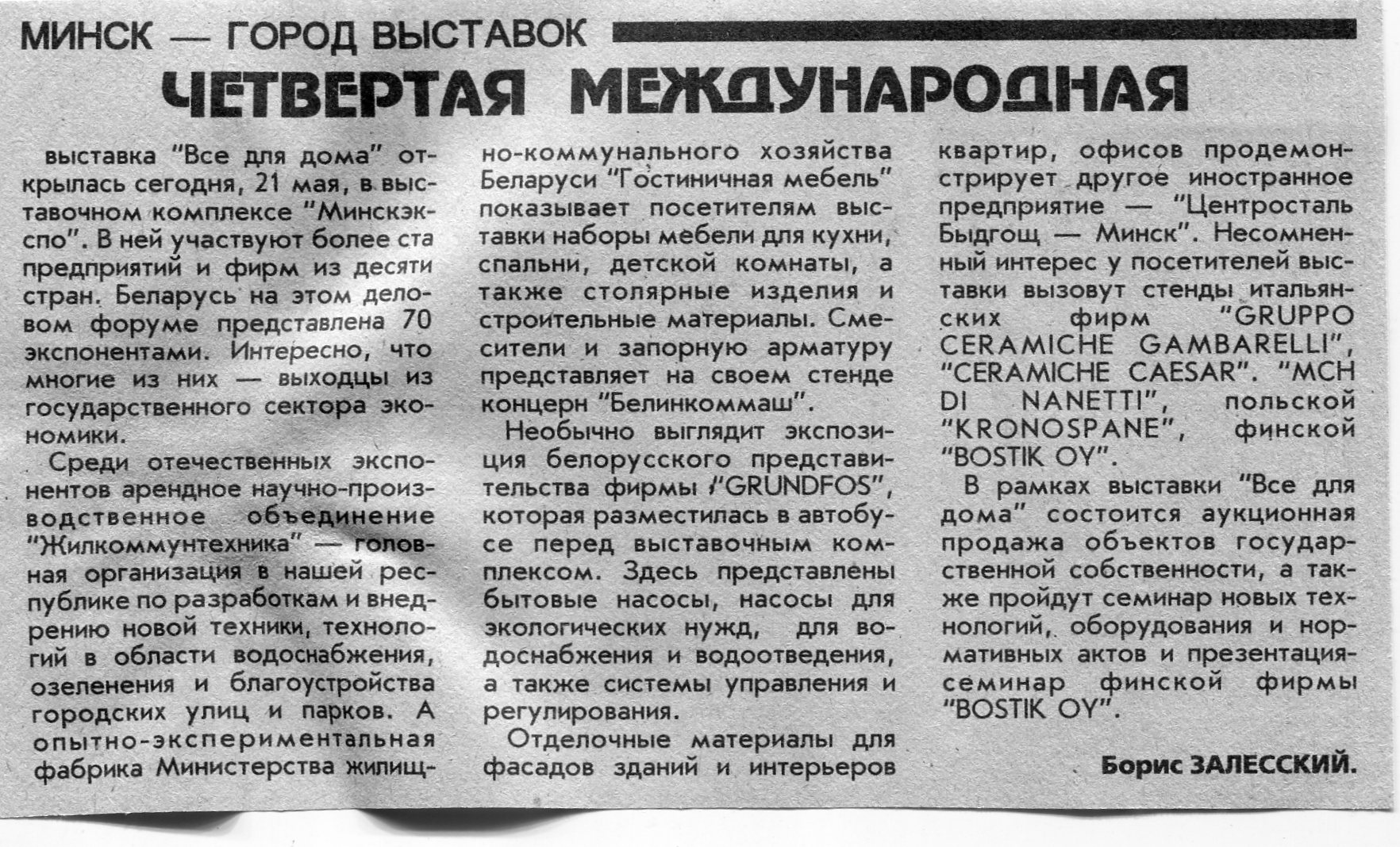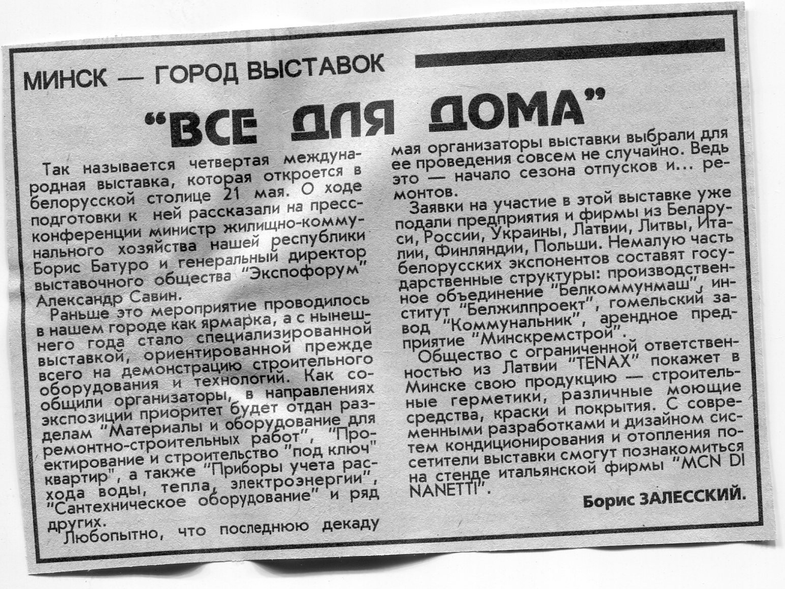 Залесский, Б. "Все для дома" / Б. Залесский // Вечерний Минск. - 1996. - 2 мая.