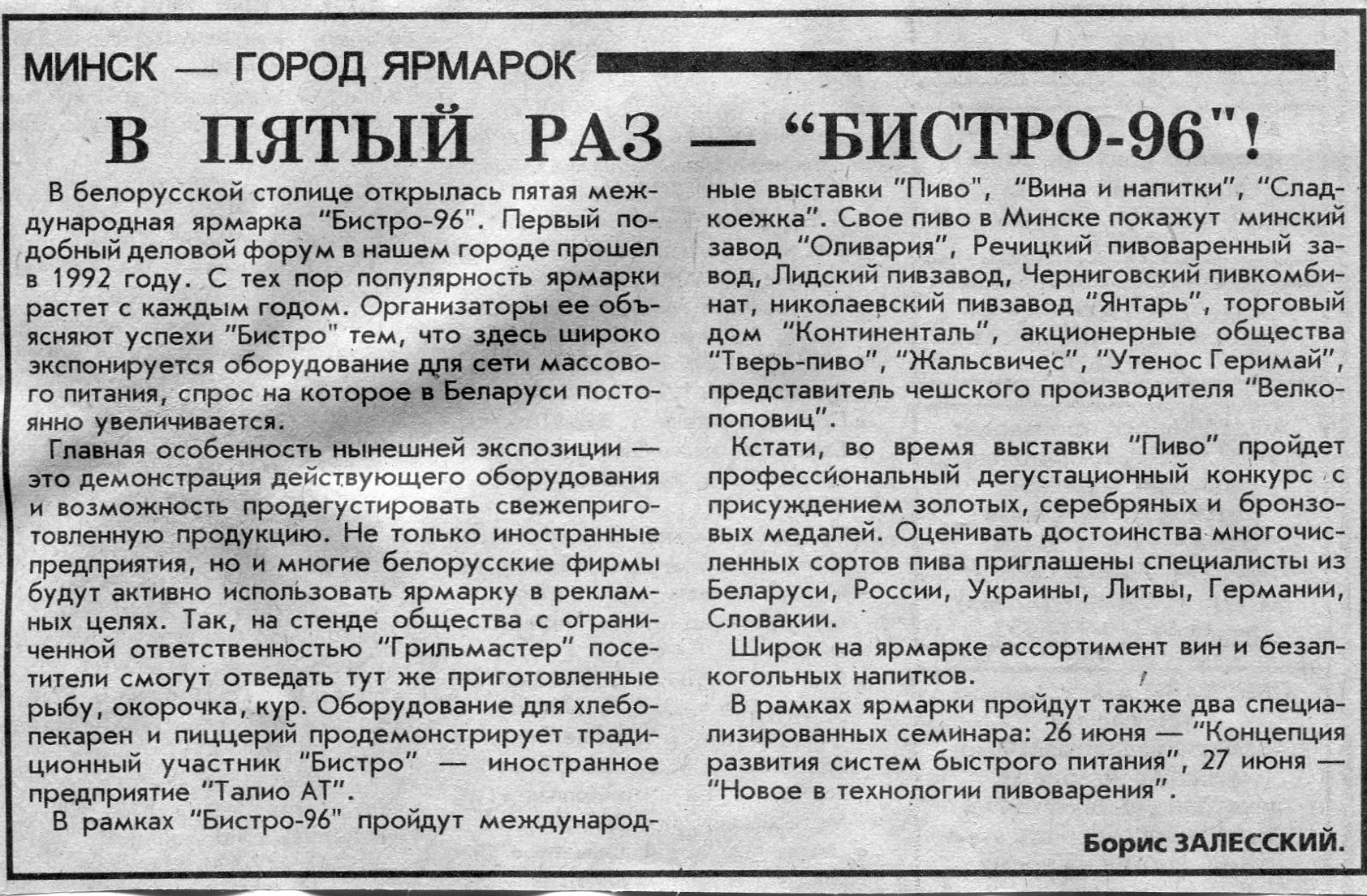 Залесский, Б. В пятый раз - "Бистро-96" / Б. Залесский // Вечерний Минск. - 1996. - 25 июн.