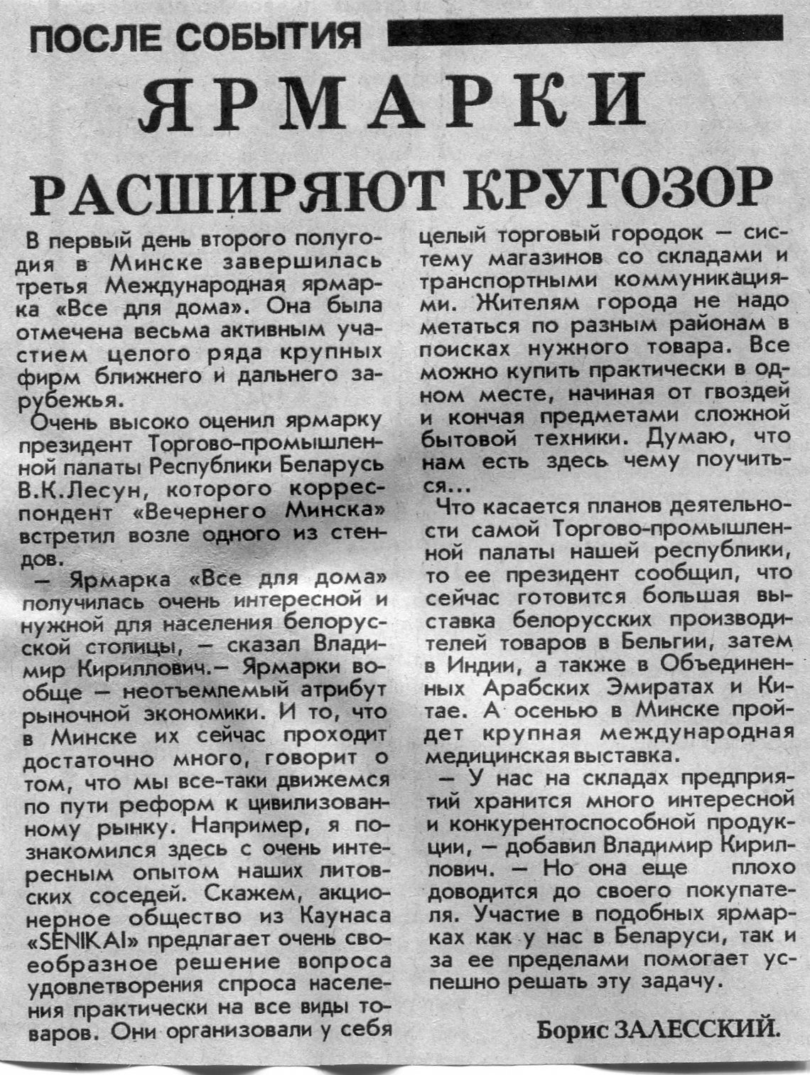 Залесский, Б. Ярмарки расширяют кругозор / Б. Залесский // Вечерний Минск. – 1995. – 3 июл.