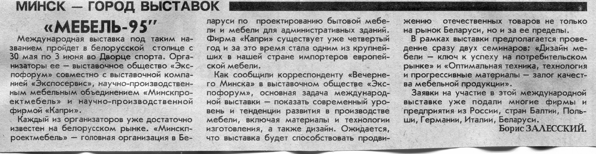 Залесский, Б. "Мебель-95" / Б. Залесский // Вечерний Минск. – 1995. – 16 мая.