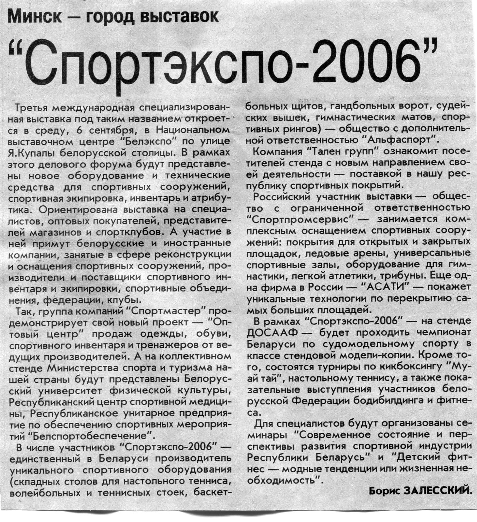 Залесский, Б. "Спортэкспо-2006" / Б. Залесский // Вечерний Минск. – 2006. – 31 авг.