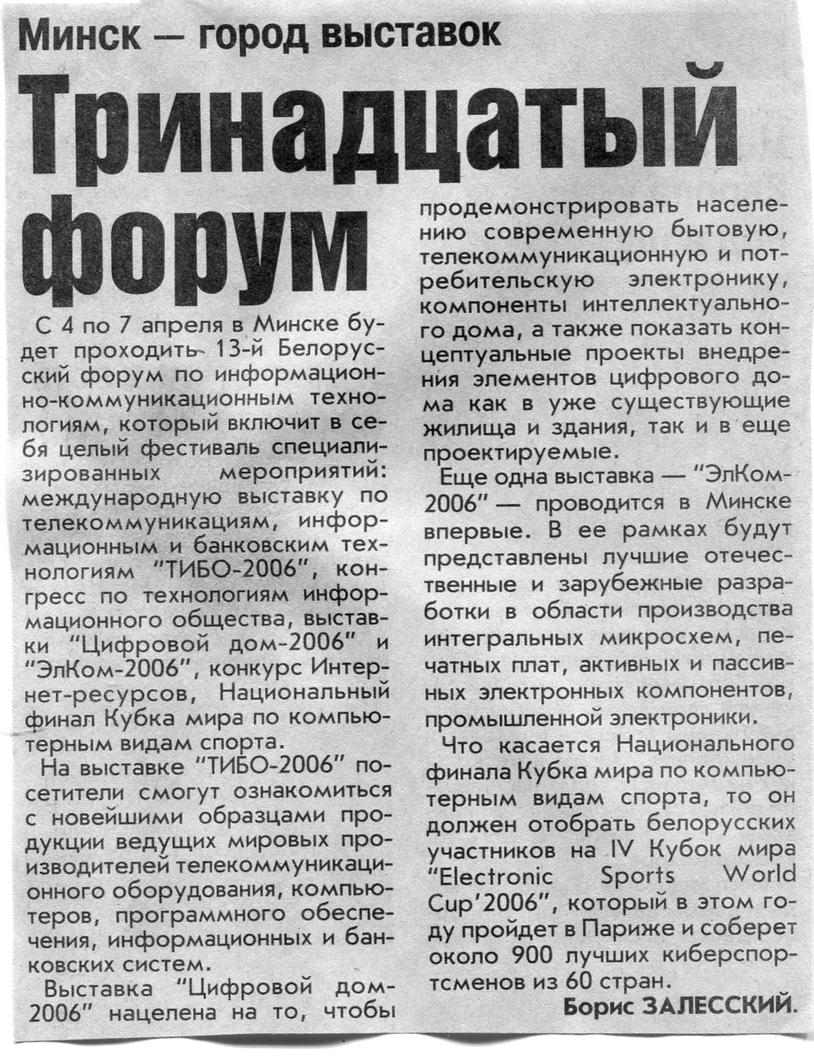 Залесский, Б. Три форума под одной крышей / Б. Залесский // Вечерний Минск. – 2006. – 18 апр.