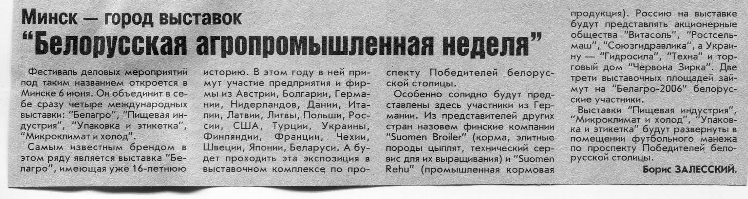 Залесский, Б. "Белорусская агропромышленная неделя" / Б. Залесский // Вечерний Минск. – 2006. – 1 июн.