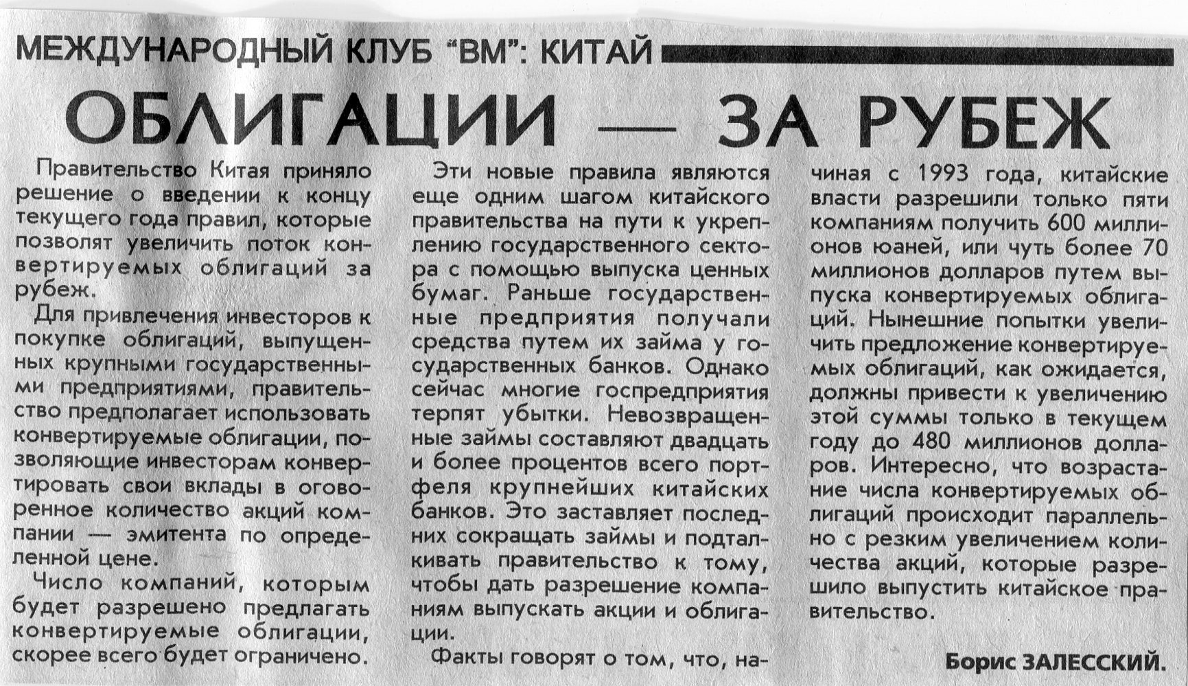 Залесский, Б. Облигации - за рубеж / Б. Залесский // Вечерний Минск. - 1997. - 8 сент.