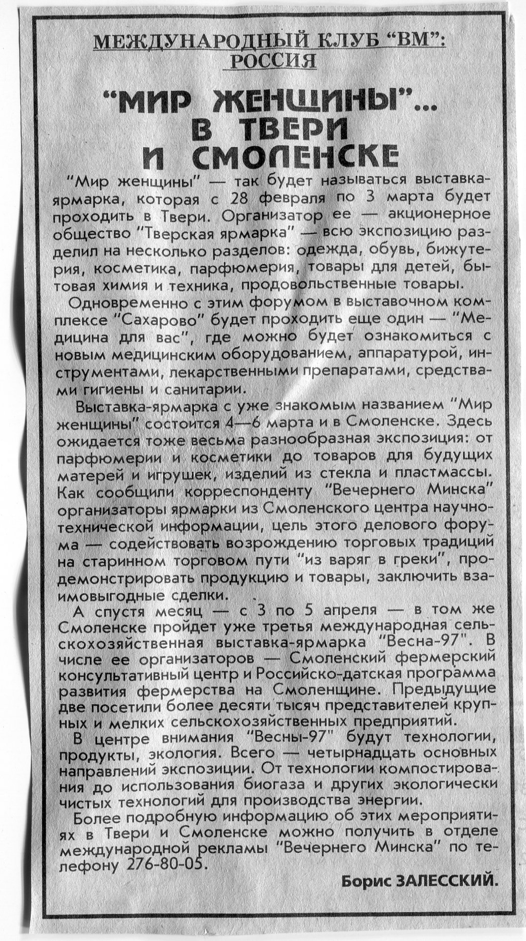 Залесский, Б. "Мир женщины" - в Твери и Смоленске / Б. Залесский // Вечерний Минск. - 1997. - 24 февр.
