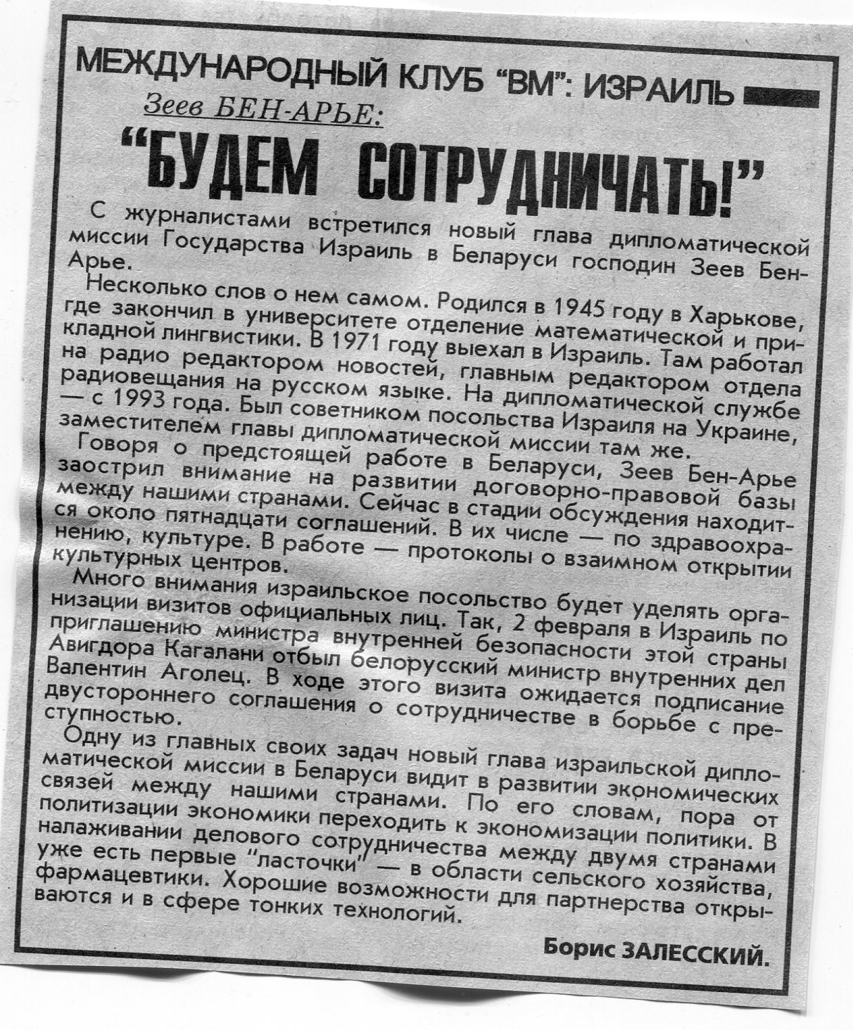 Залесский, Б. Зеев Бен-Арье: "Будем сотрудничать!" / Б. Залесский // Вечерний Минск. - 1997. - 4 февр.