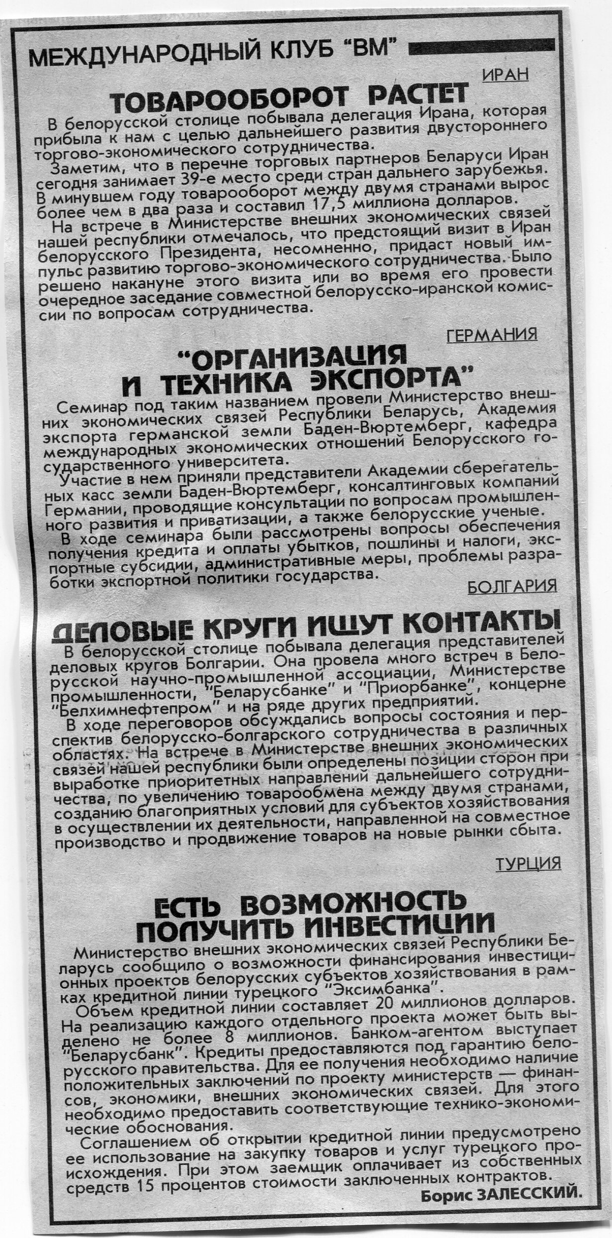 Залесский, Б. Международный клуб "ВМ" / Б. Залесский // Вечерний Минск. - 1997. - 12 мар.