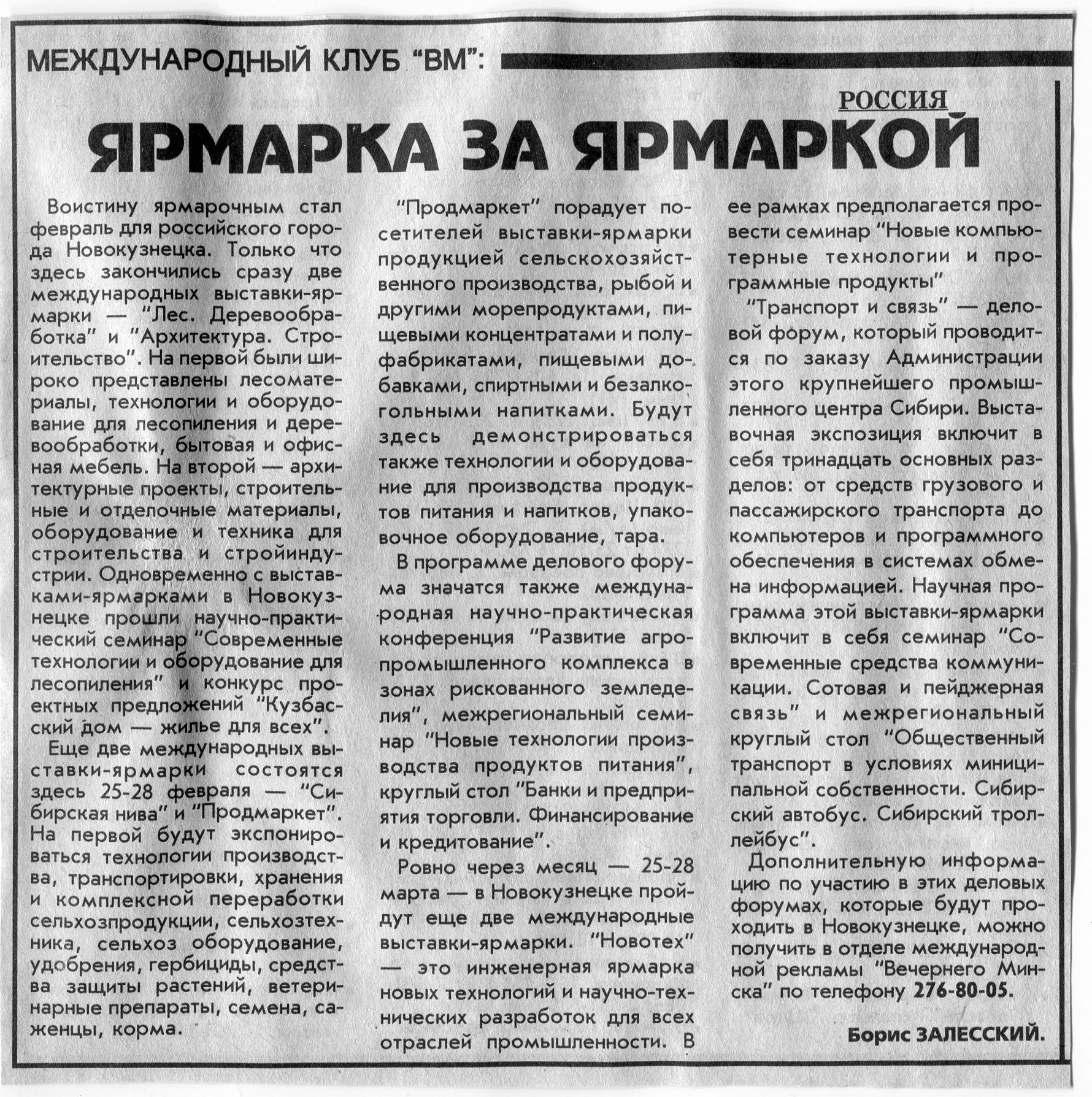 Залесский, Б. Ярмарка за ярмаркой / Б. Залесский // Вечерний Минск. - 1997. - 26 февр.