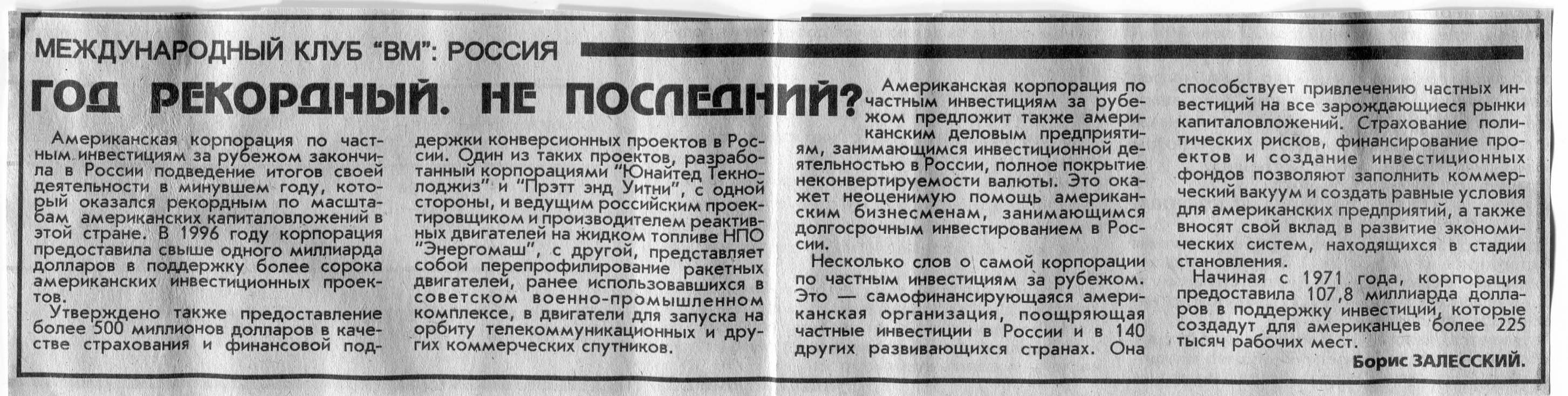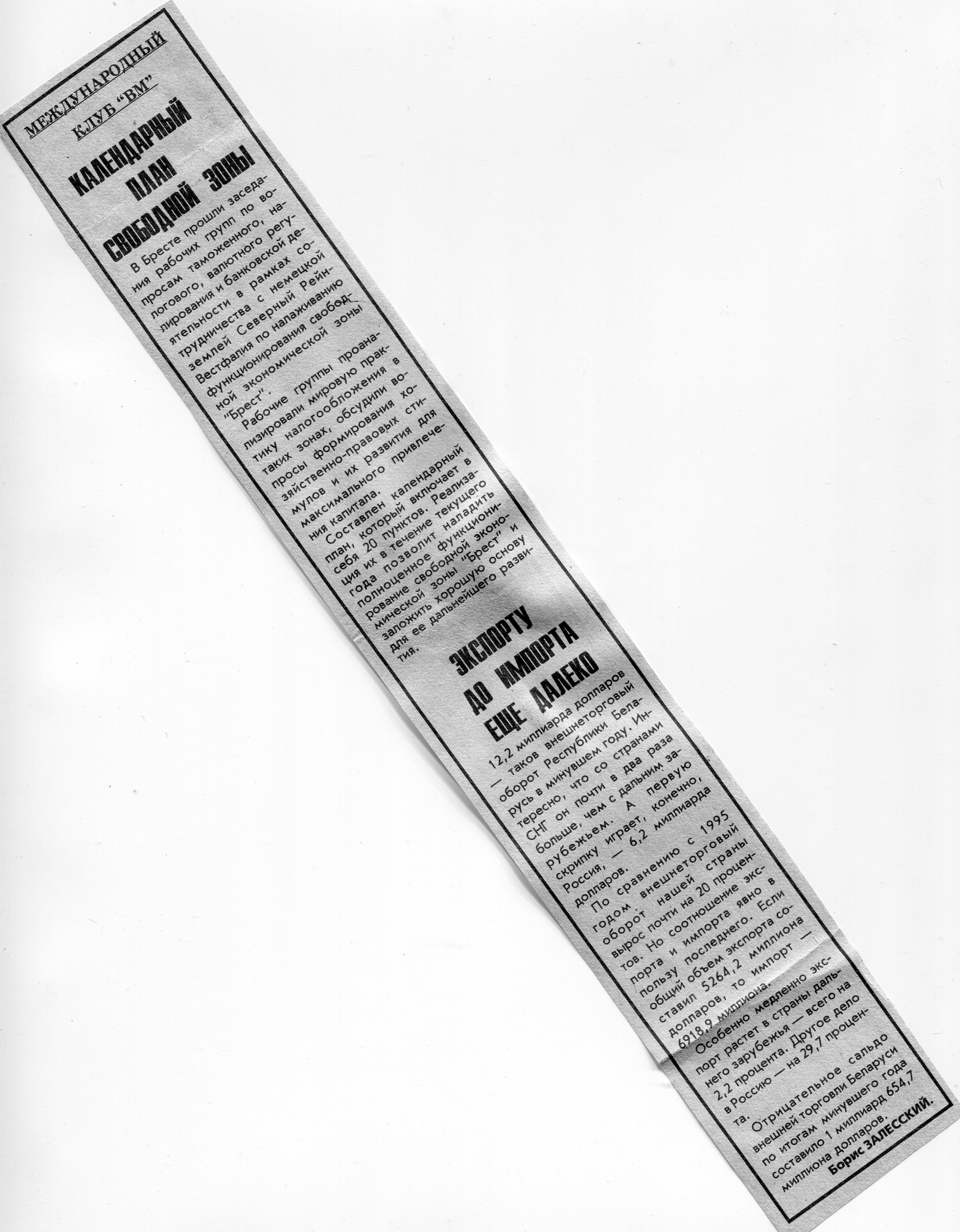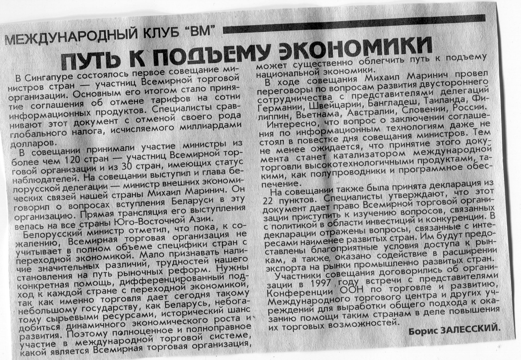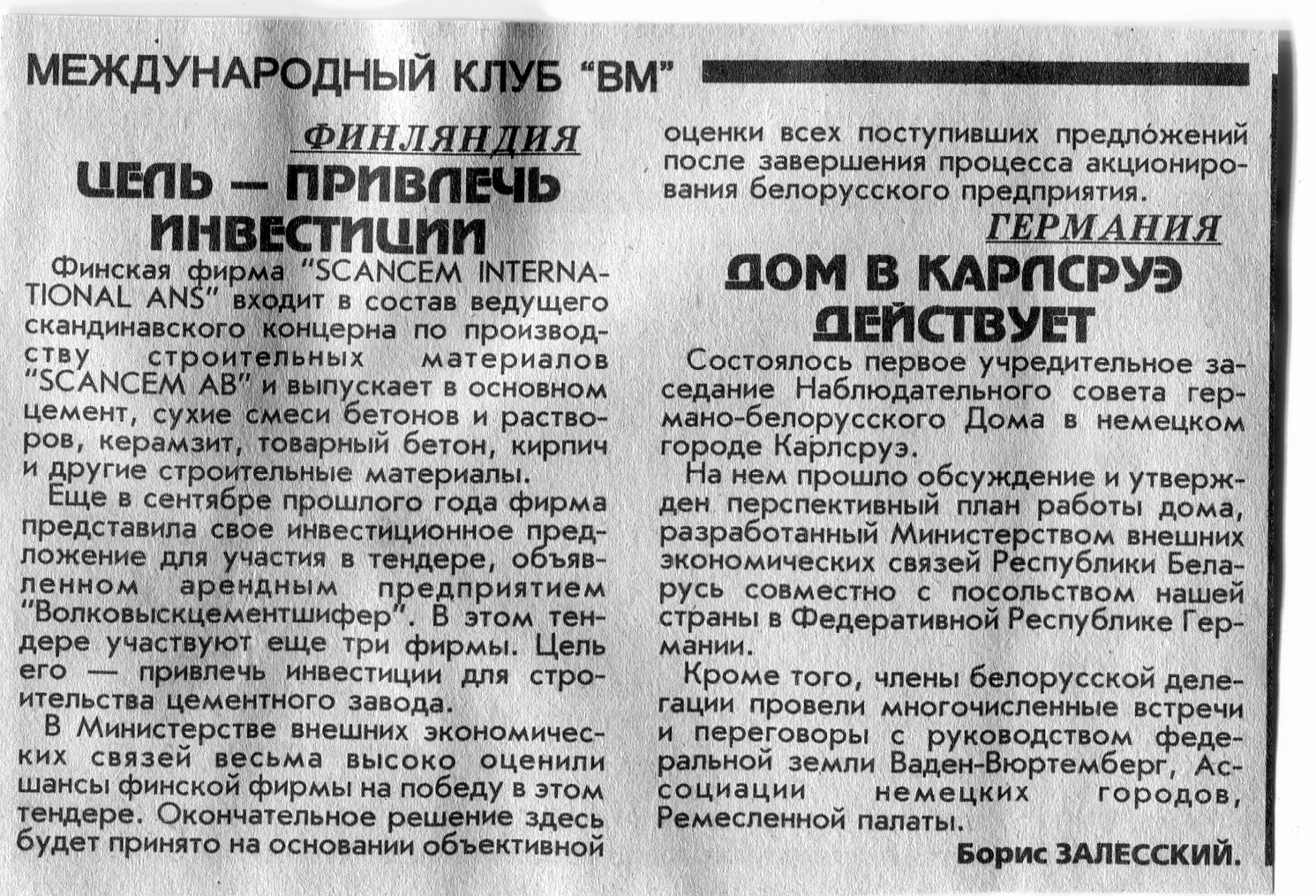 Залесский, Б. Международный клуб "ВМ" / Б. Залесский // Вечерний Минск. - 1997. - 30 янв.